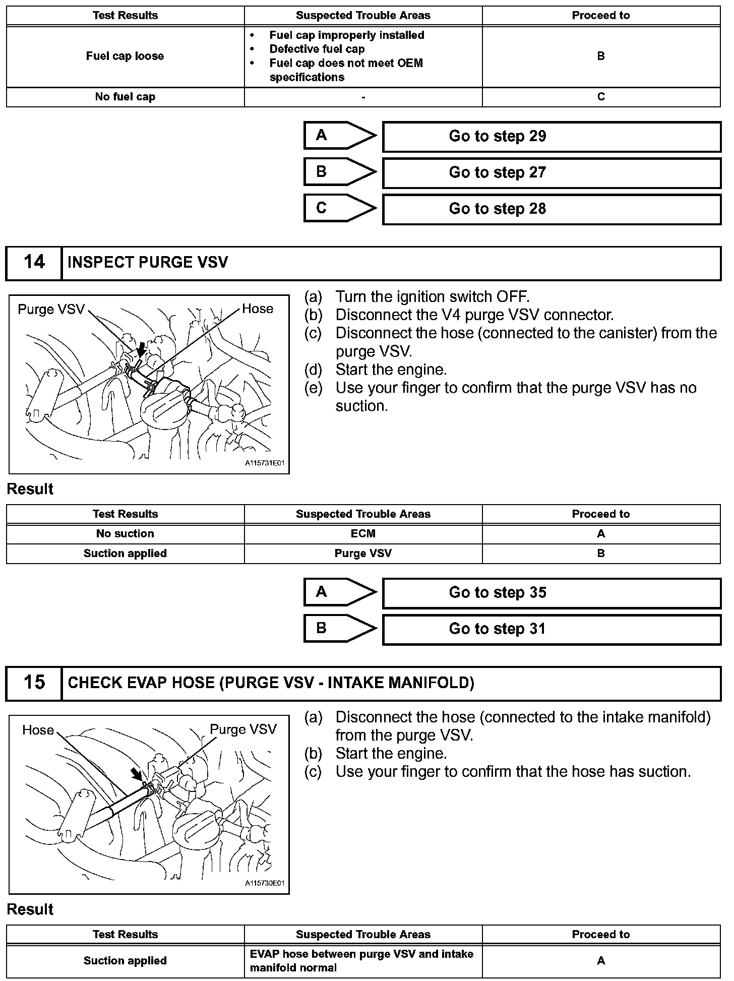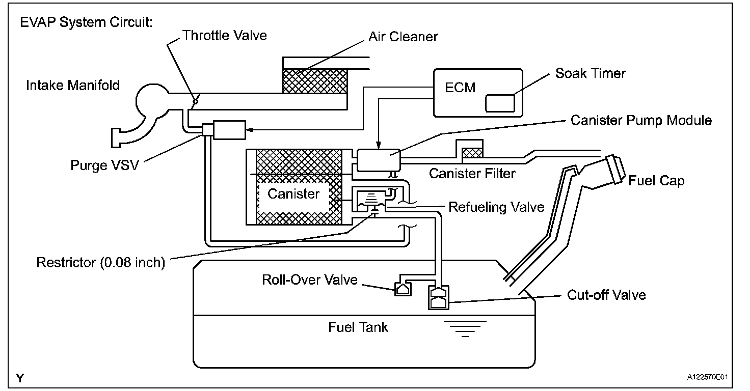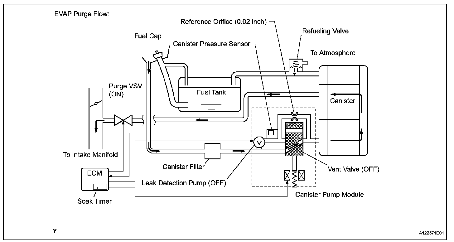 While the engine is running, if a predetermined condition (closed-loop etc.) is met, the purge VSV is opened by the ECM and stored fuel vapors in the canister are purged to the intake manifold. The ECM changes the duty cycle ratio of the purge VSV to control purge flow volume.