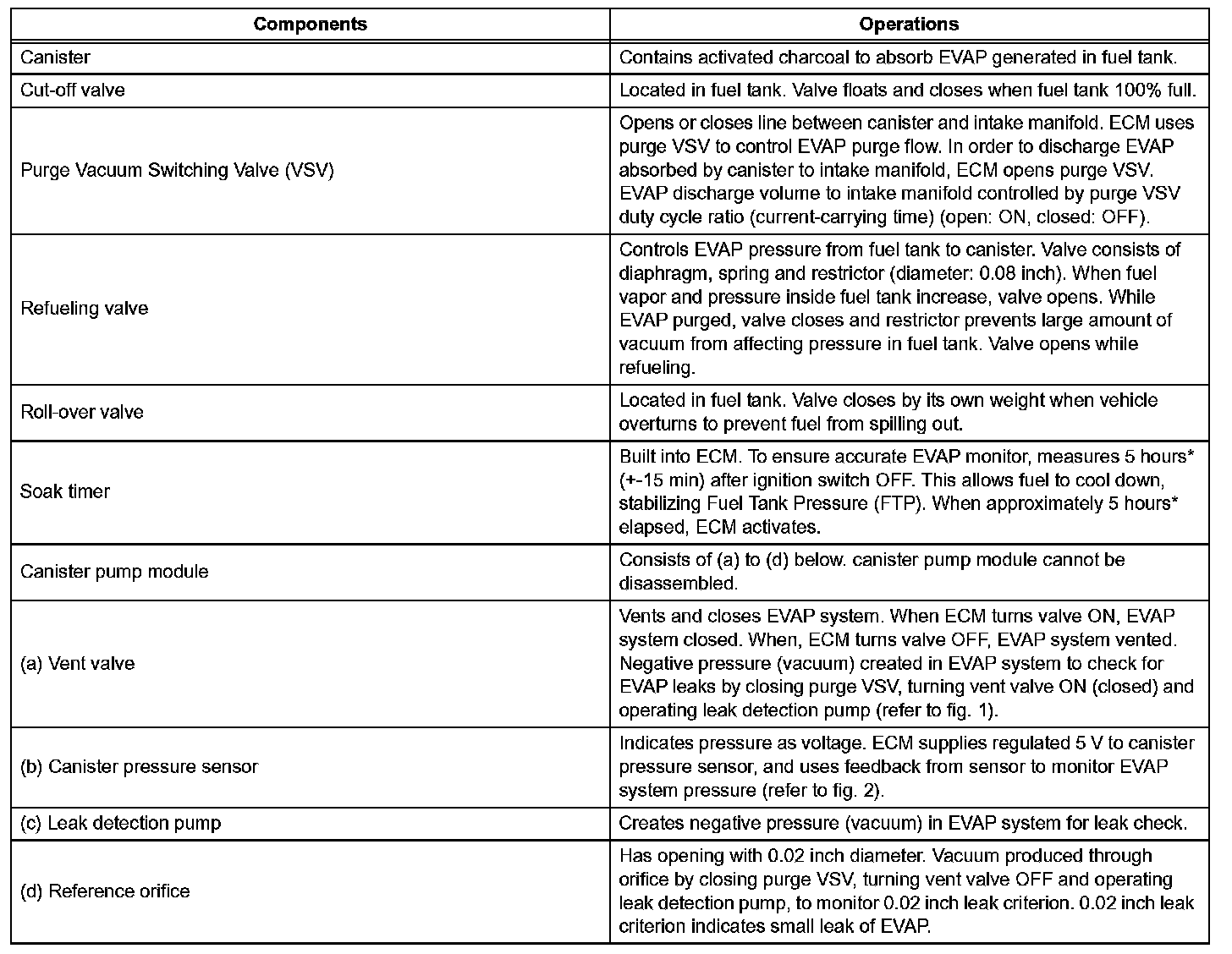 This monitor checks for Evaporative Emission (EVAP) system leaks and canister pump module malfunctions. The monitor starts 5 hours* after the ignition switch is turned OFF. More than 5 hours are required to allow the fuel to cool down to stabilize the Fuel Tank Pressure (FTP), thus making the EVAP system monitor more accurate.