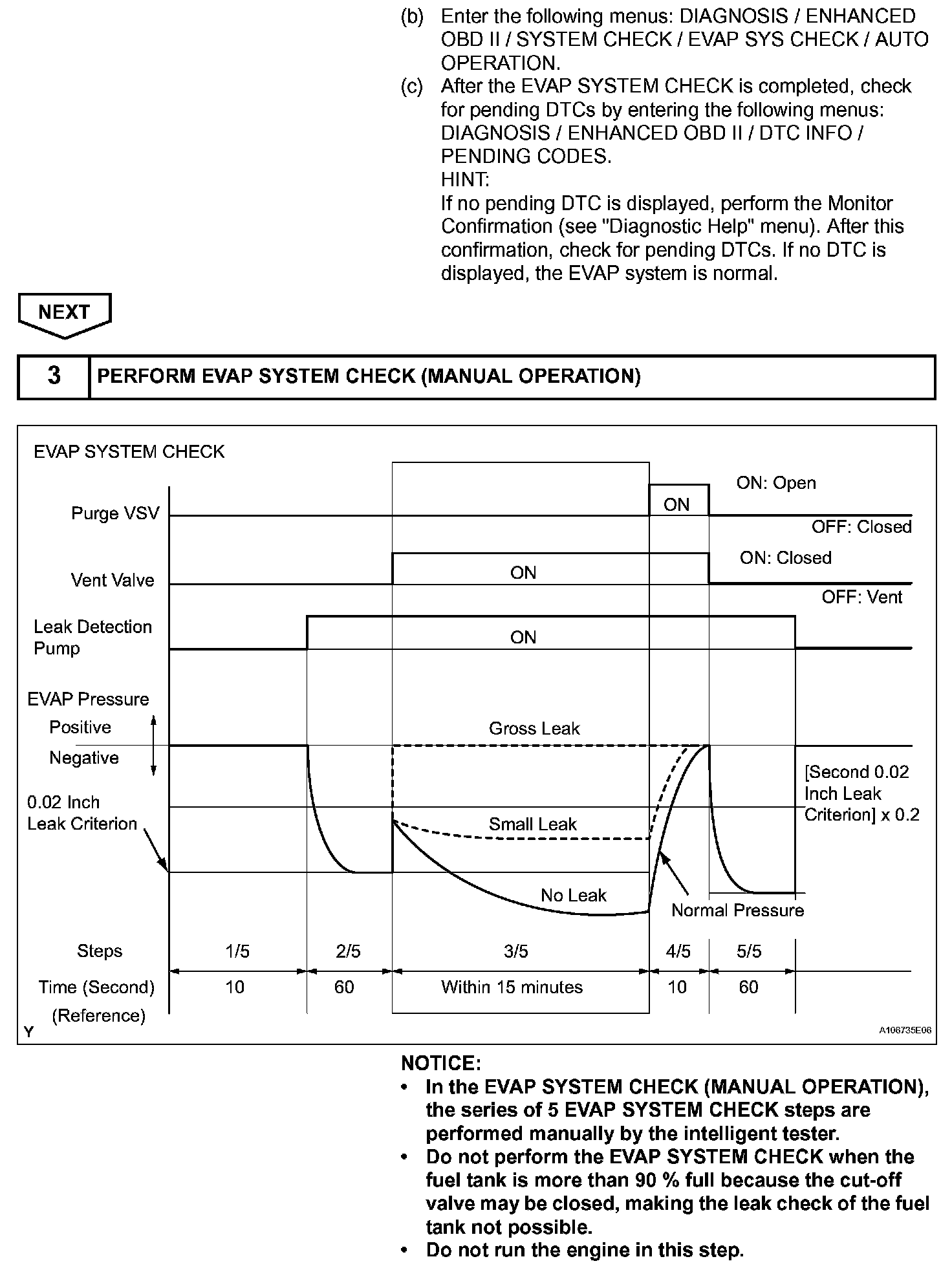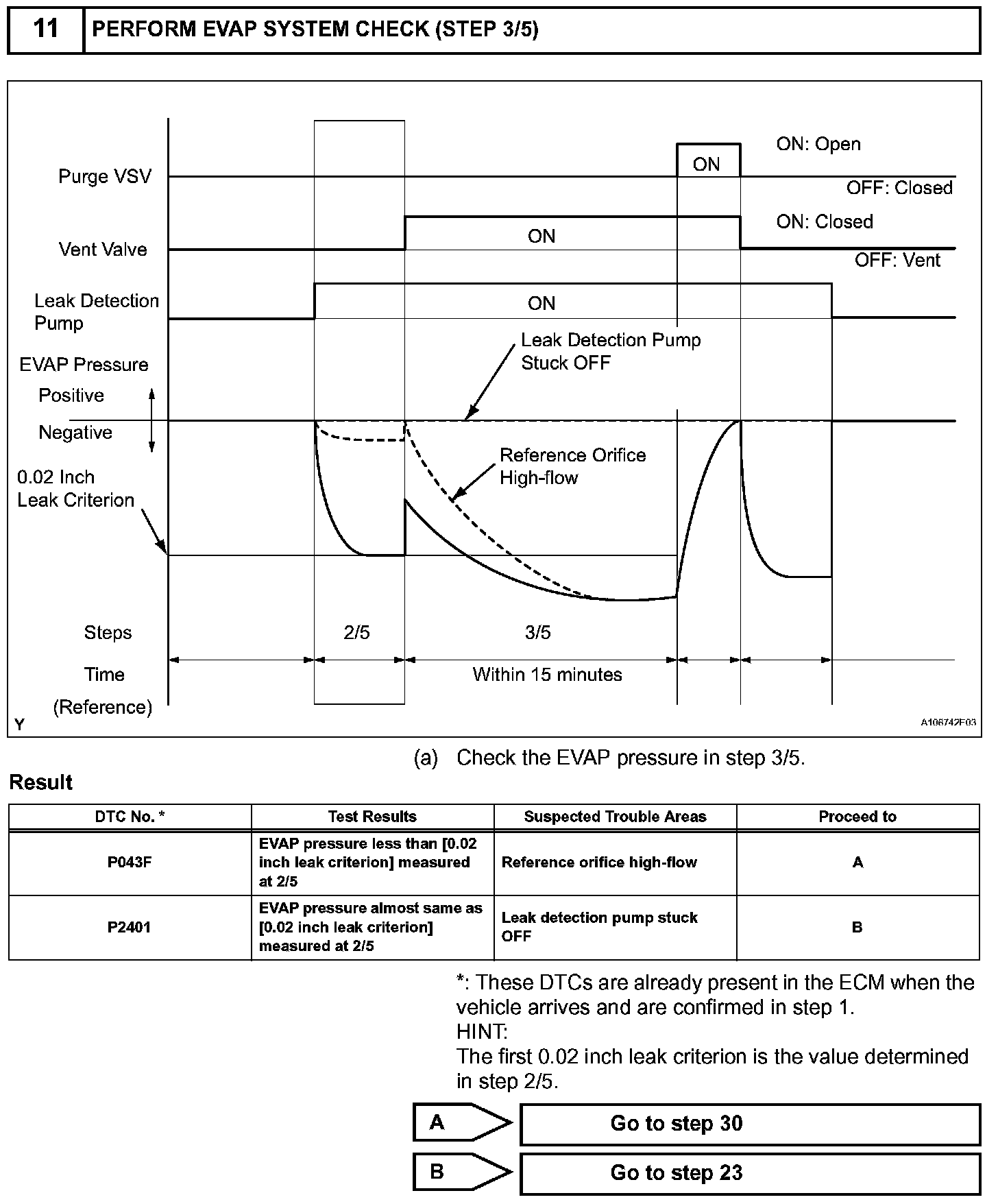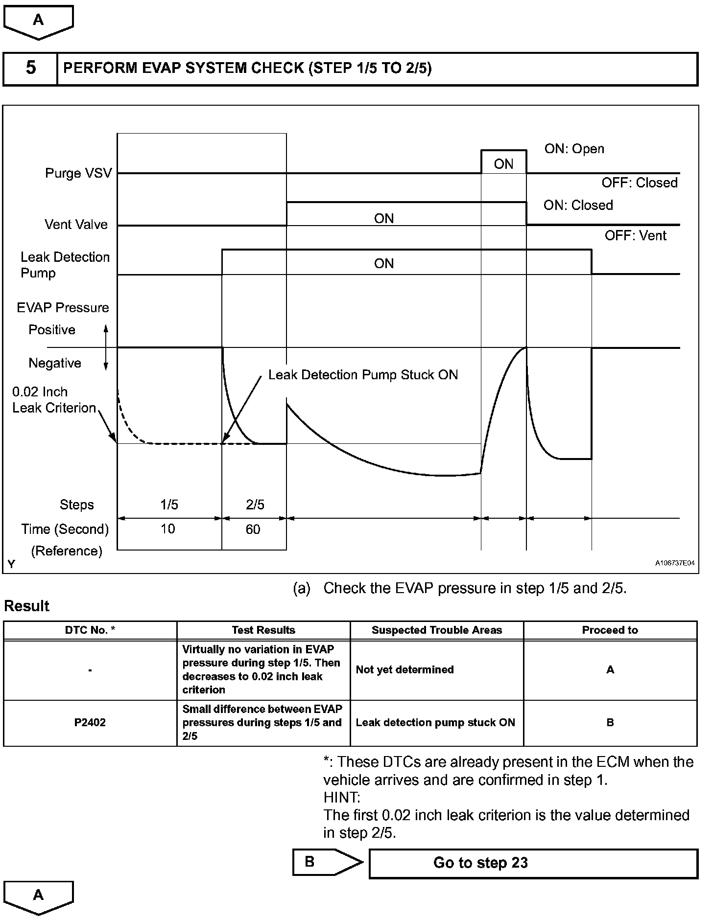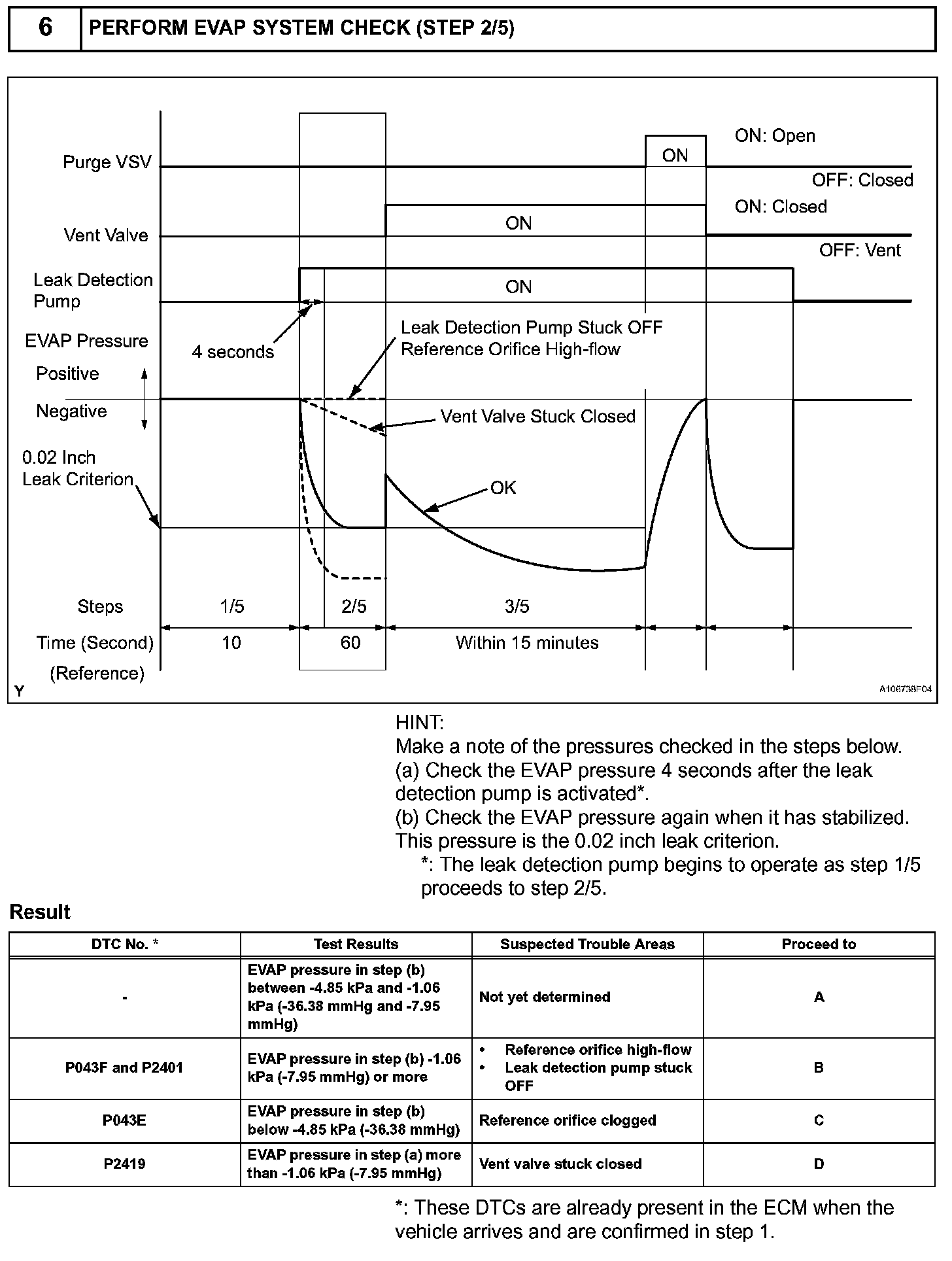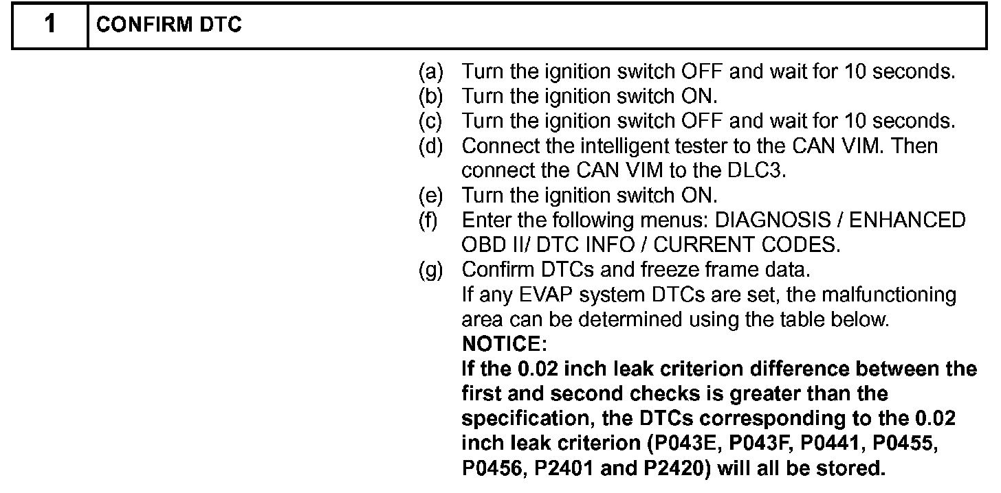 NOTE: If the 0.02 inch leak criterion difference between the first and second checks is greater than the specification, the DTCs corresponding to the 0.02 inch leak criterion (P043E, P043F, P0441, P0455, P0456, P2401 and P2420) will all be stored.