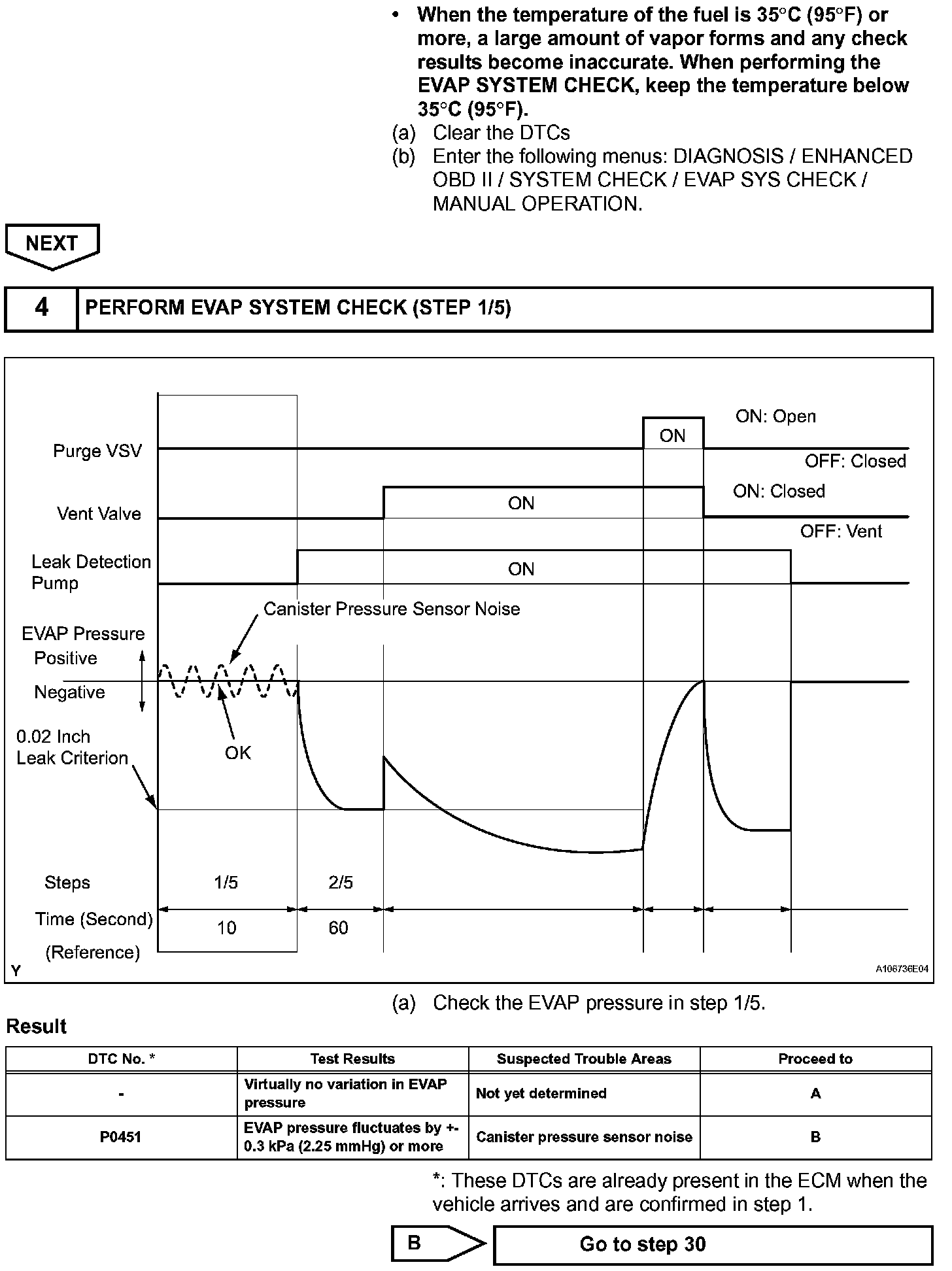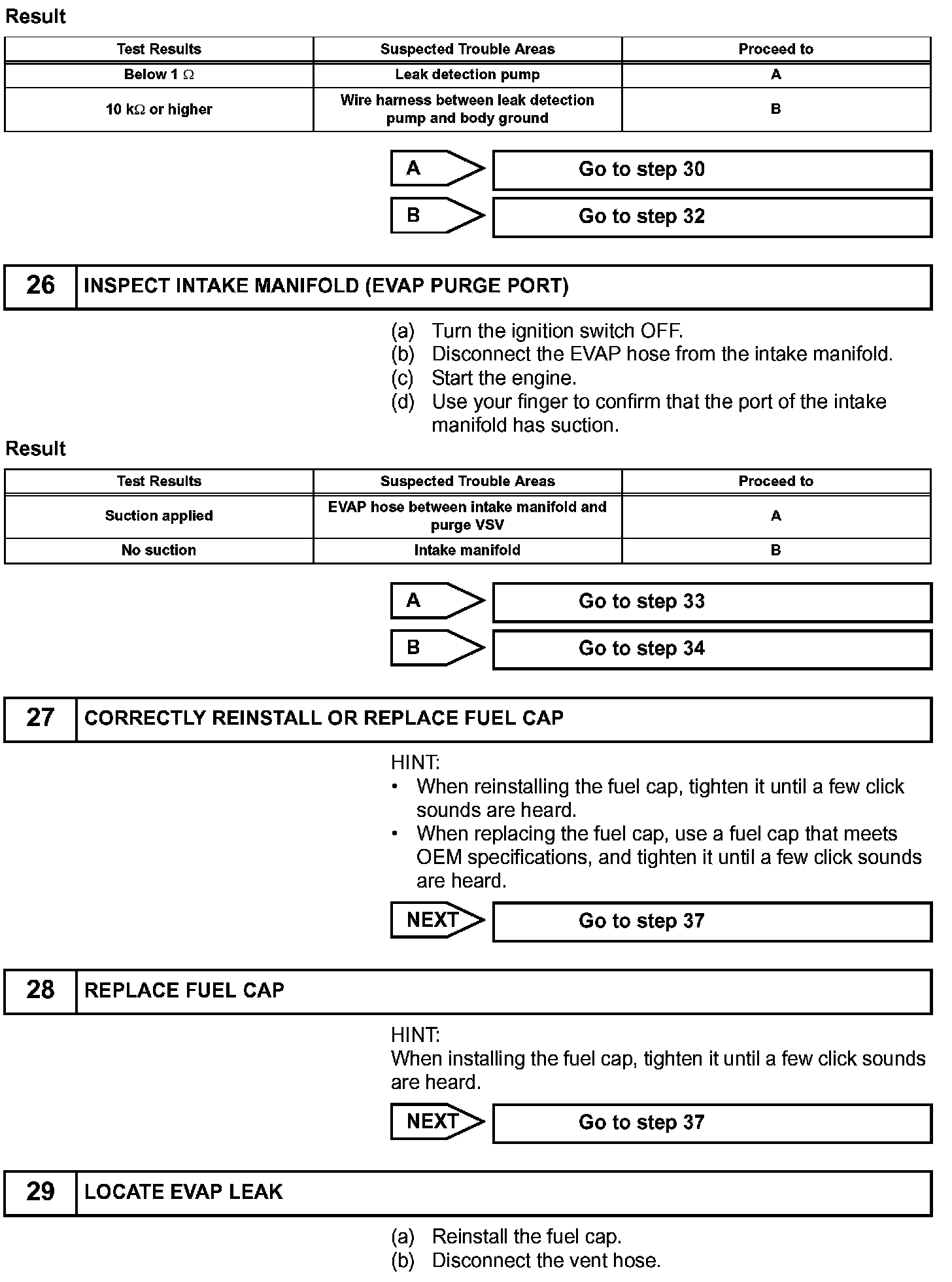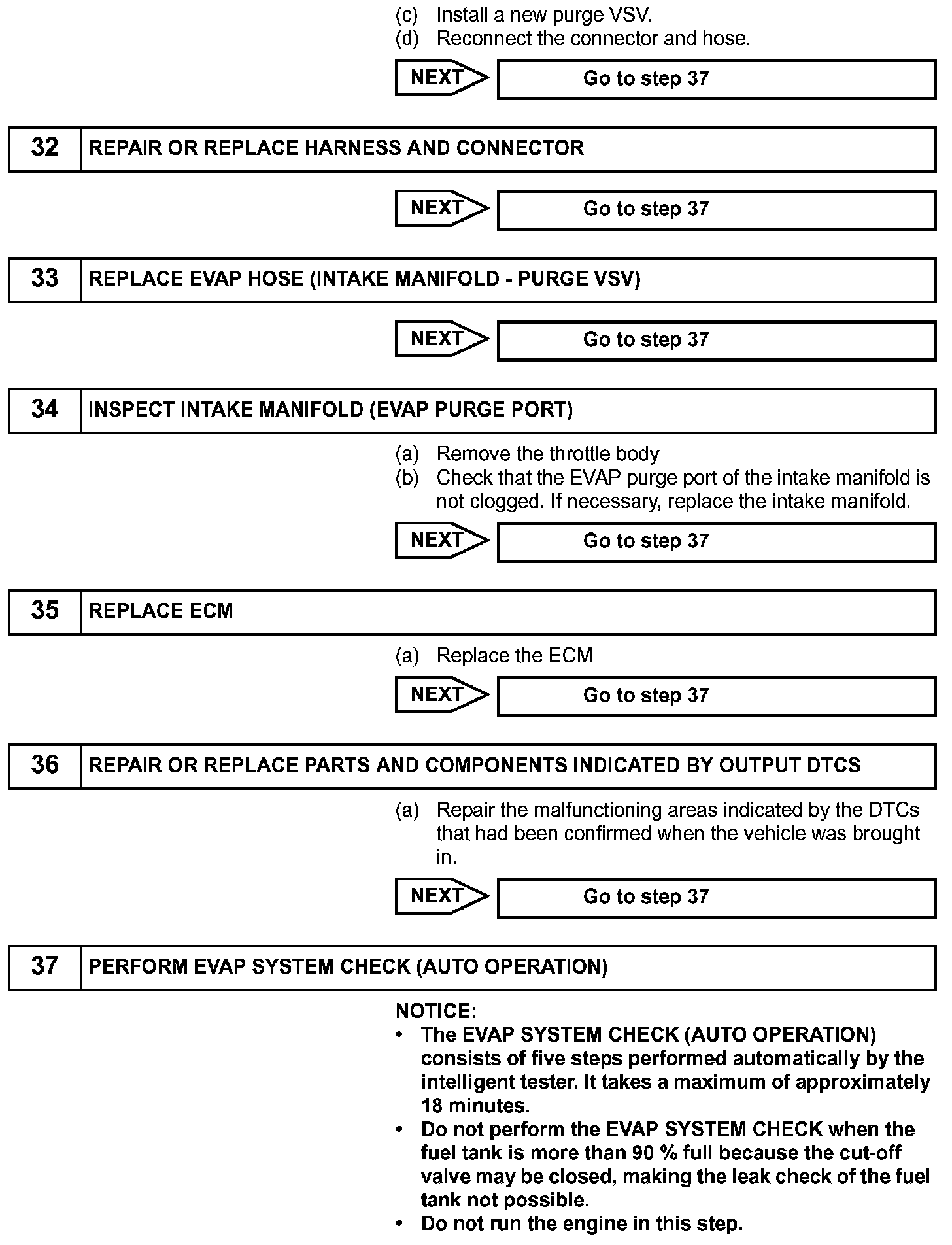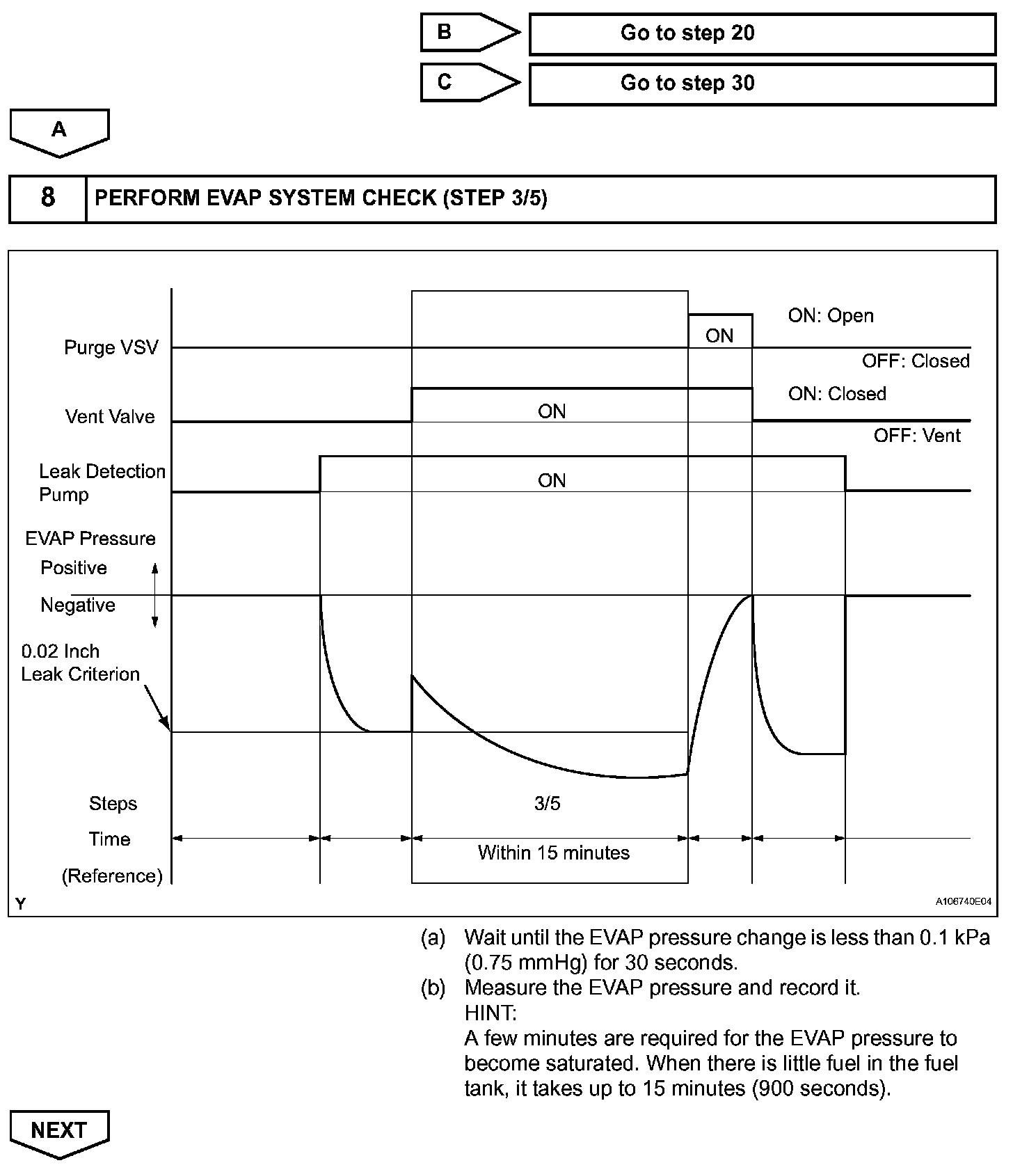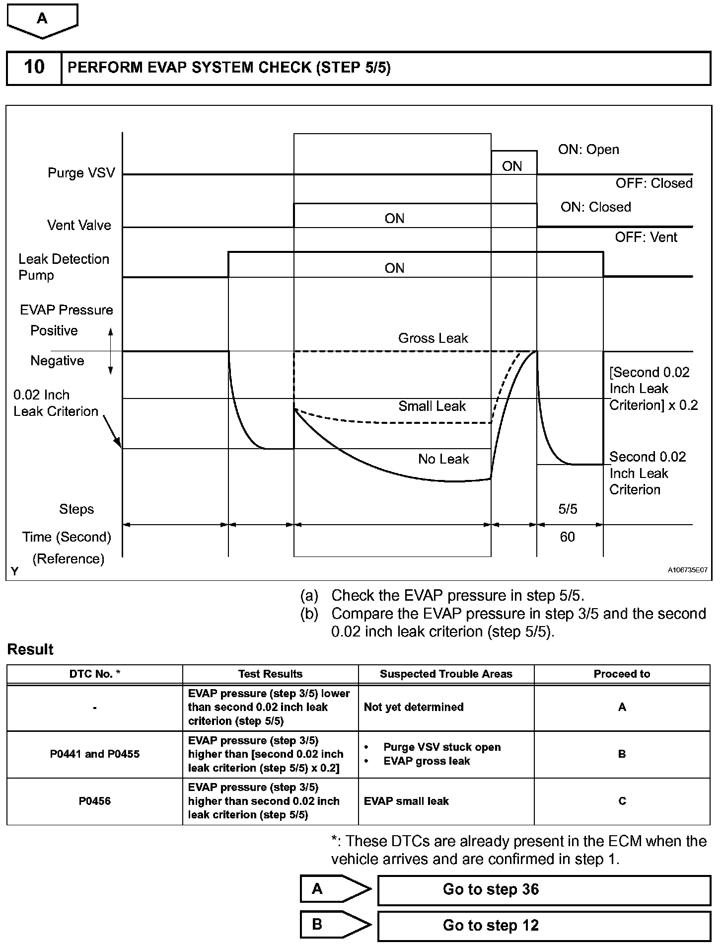 NOTE: If the 0.02 inch leak criterion difference between the first and second checks is greater than the specification, the DTCs corresponding to the 0.02 inch leak criterion (P043E, P043F, P0441, P0455, P0456, P2401 and P2420) will all be stored.
