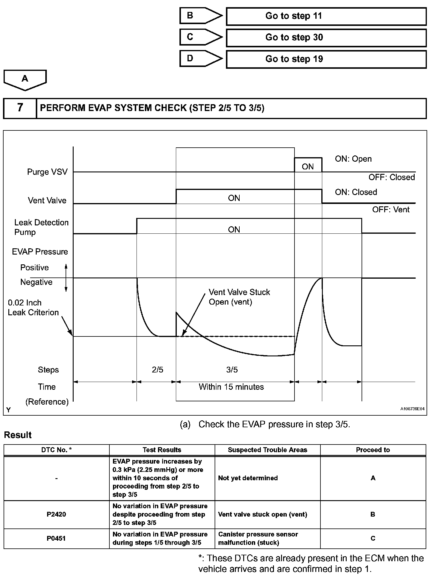 The vent valve turned OFF (open) and the EVAP pressure is then measured. If the variation in the pressure is less than 0.5 kPa (3.75 mmHg), the ECM interprets this as the purge VSV being stuck closed, and illuminates the MIL and sets DTC P0441 (2 trip detection logic).
