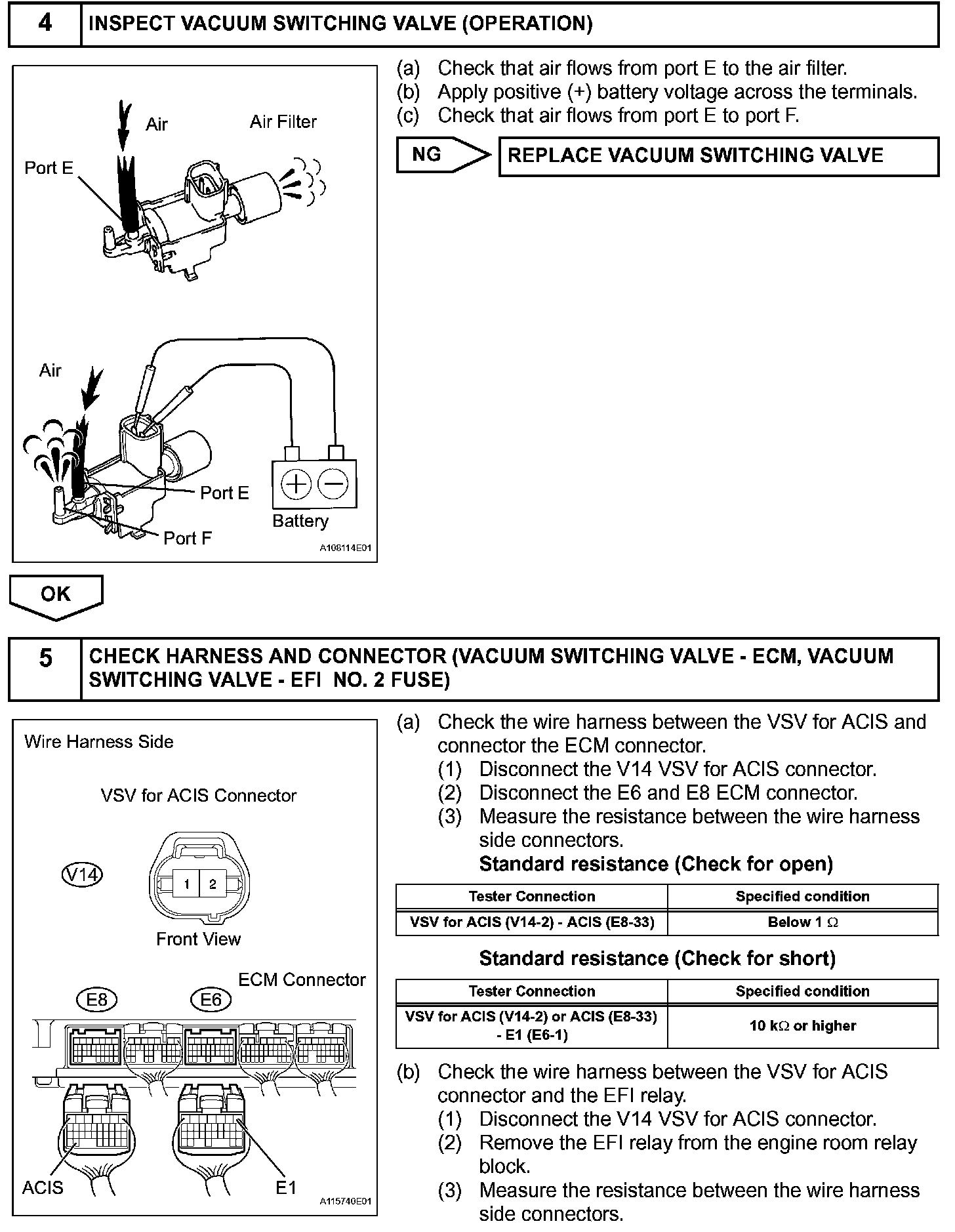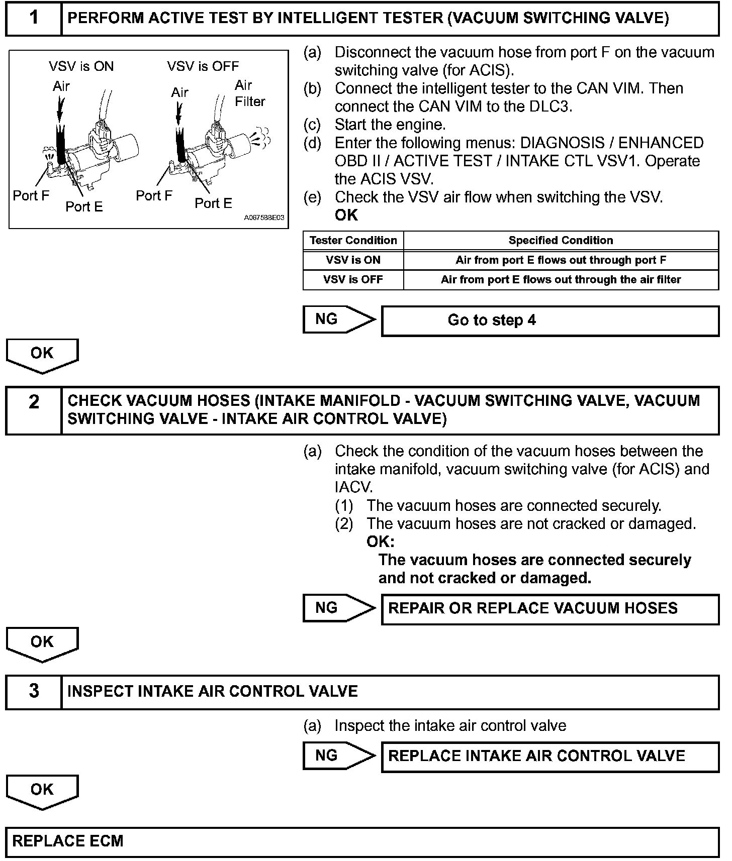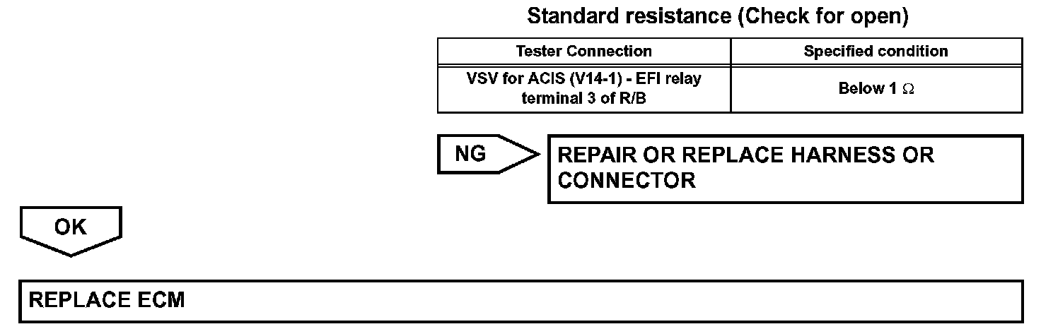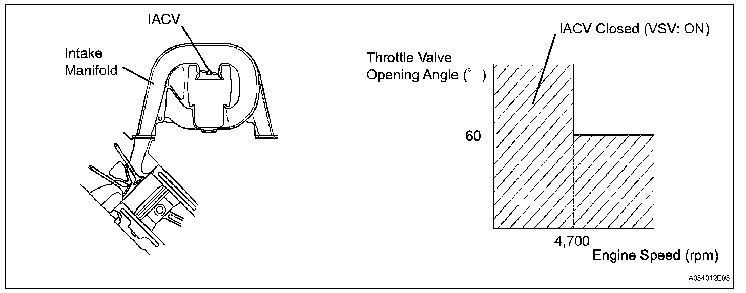 When the engine speed is 4,700 rpm or more and the throttle valve opening angle is 60 degree or more, the IACV is open (VSV: OFF). At all other times, the IACV is closed (VSV: ON).