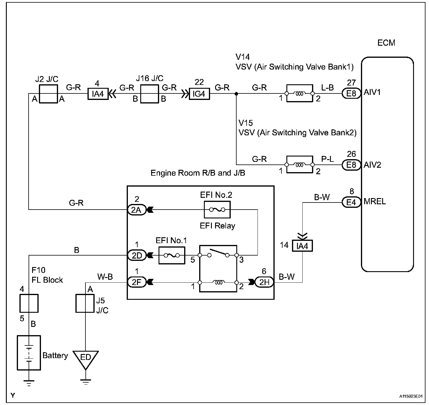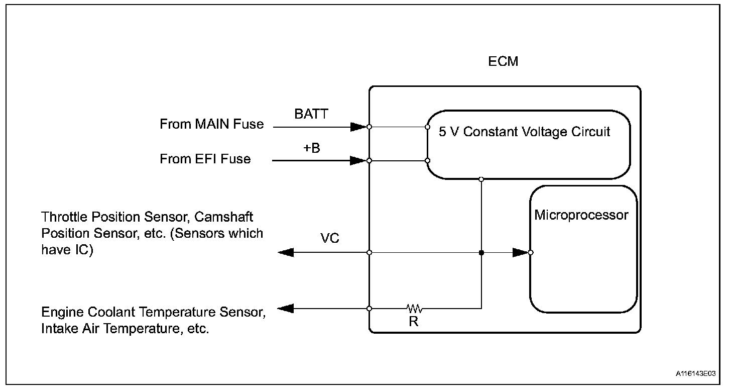 The ECM constantly generates 5 V power from the battery voltage supplied to the +B (BATT) terminal to operate the microprocessor. The ECM also provides this power to the sensors through the VC output circuit.