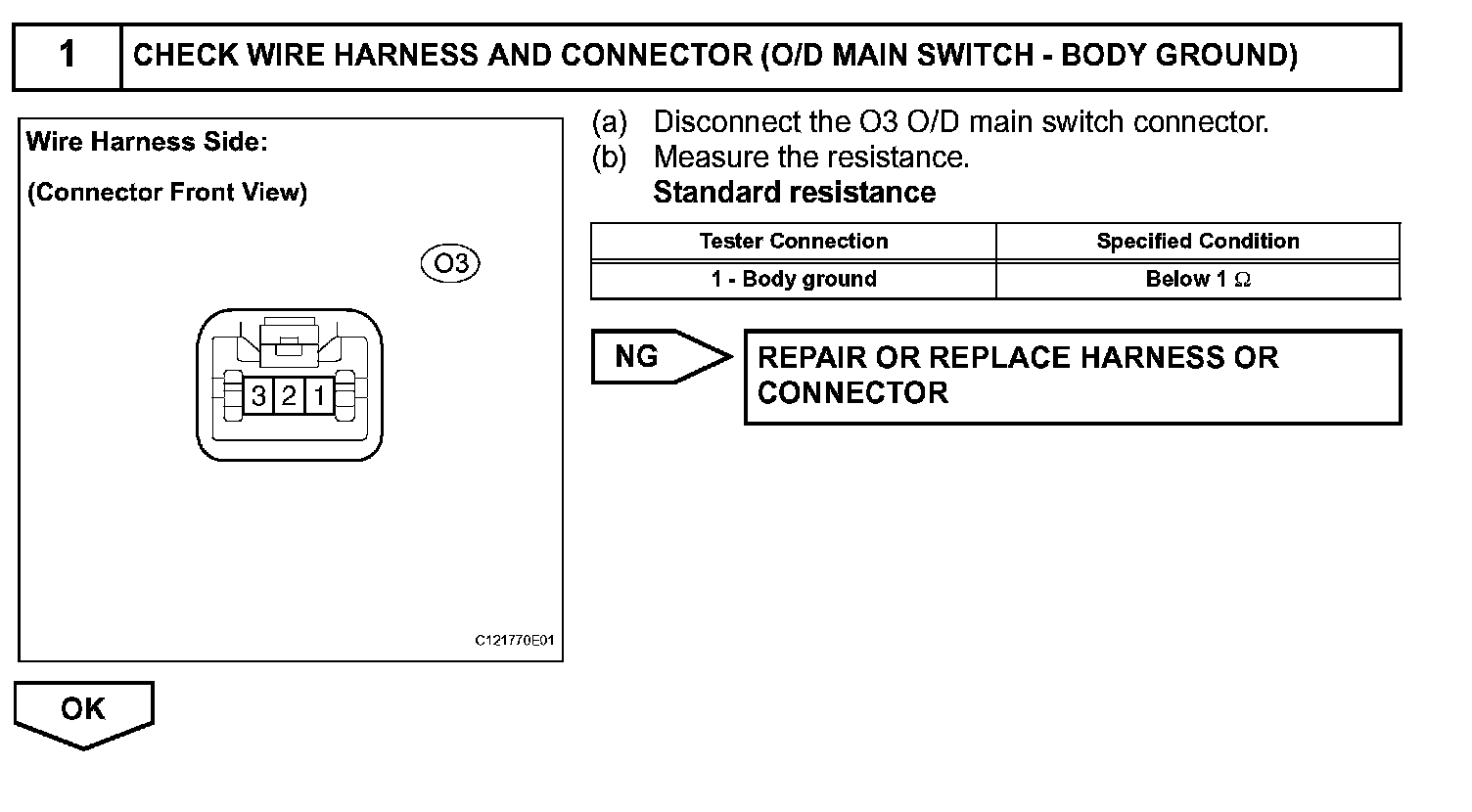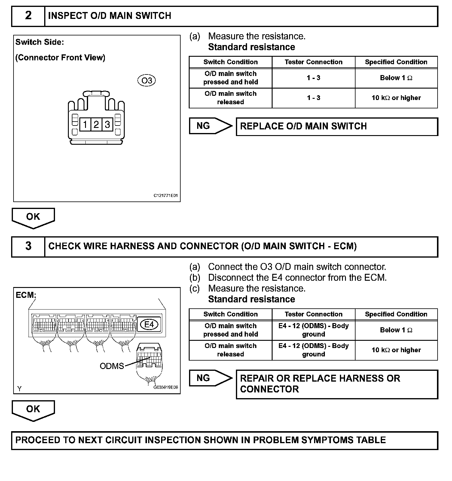 The O/D main switch (transmission control switch) is a momentary type switch. When pressing the O/D main switch once, the O/D OFF indicator light comes on and the ECM prohibits shifting into O/D. When pressing it once again, the O/D OFF indicator light goes off and the ECM allows shifting into O/D. Turning the IG switch OFF will reset the O/D OFF indicator light.