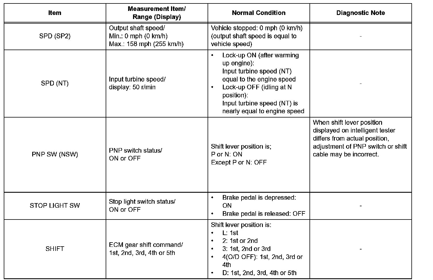 NOTICE: In the table, the values listed under Normal Condition are reference values. Do not depend solely on these reference values when deciding whether a part is faulty or not.