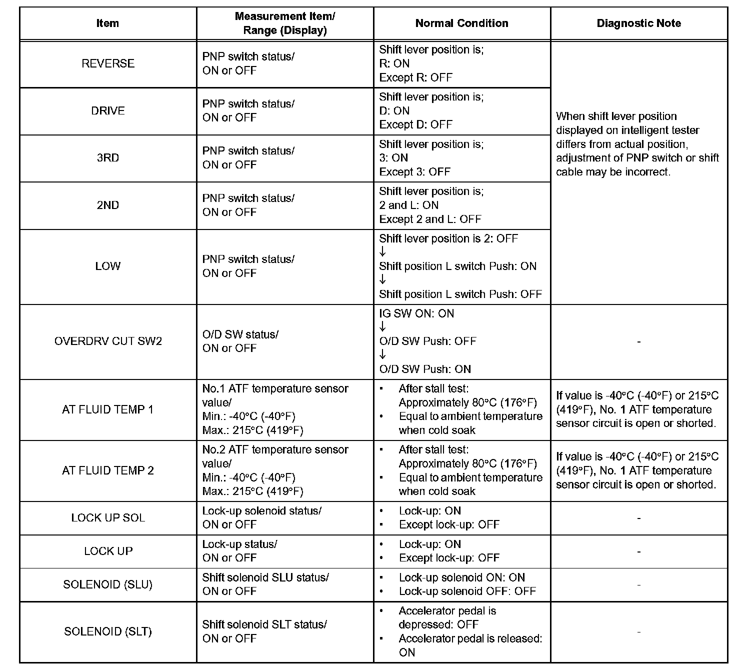 HINT: Using the intelligent tester's DATA LIST allows switch, sensor, actuator, and other item values to be read without removing any parts. Reading the DATA LIST early in troubleshooting is one way to save time.