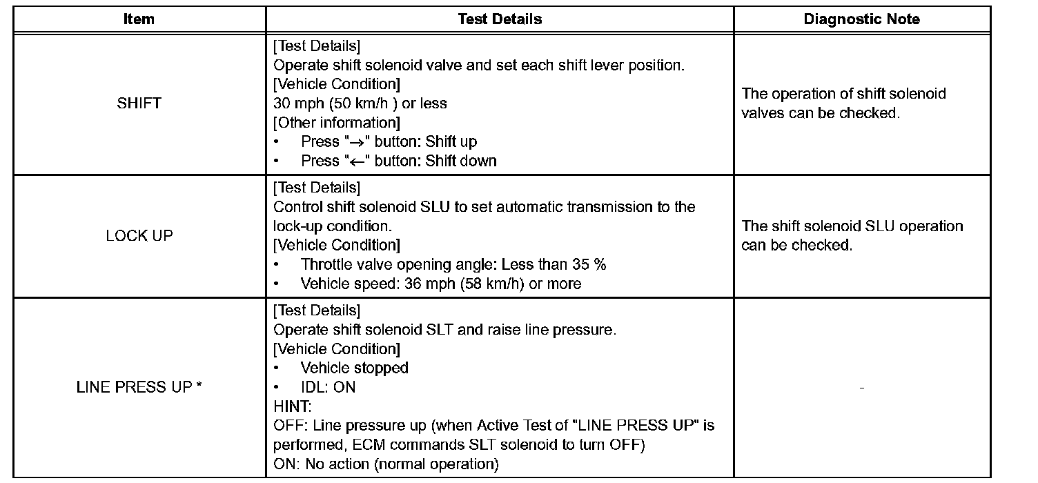 HINT: *LINE PRESS UP in the ACTIVE TEST is performed to check the line pressure changes by connecting SST to the automatic transmission, which is used in the HYDRAULIC TEST as well. Please note that the pressure values in the ACTIVE TEST and HYDRAULIC TEST are different.