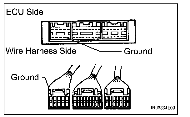 2. Disconnect the ECU connector. Check the ground terminal on the ECU side and wire harness side for bending, corrosion or foreign matter. Lastly, check the contact pressure of the female terminals.