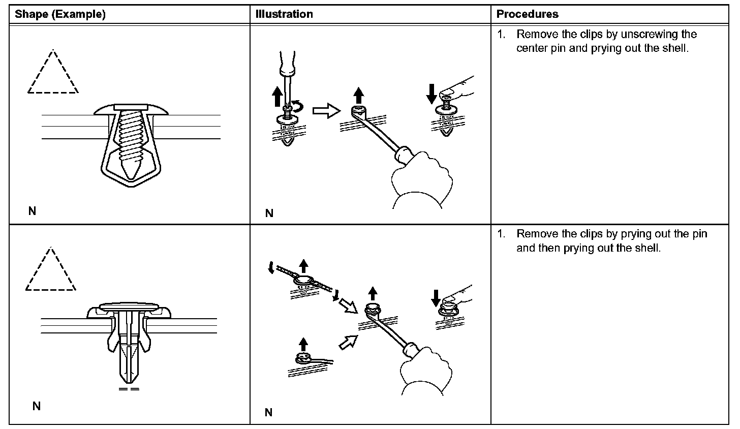 1. The removal and installation methods of typical clips used for vehicle body parts are shown in the table.