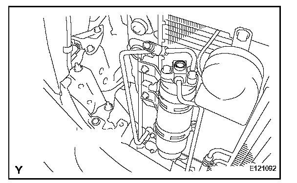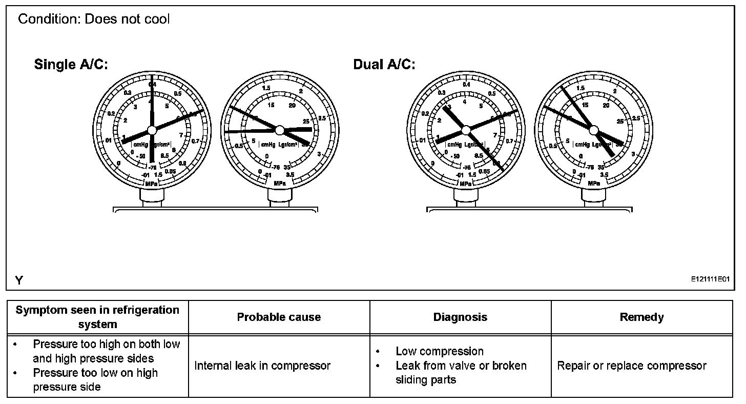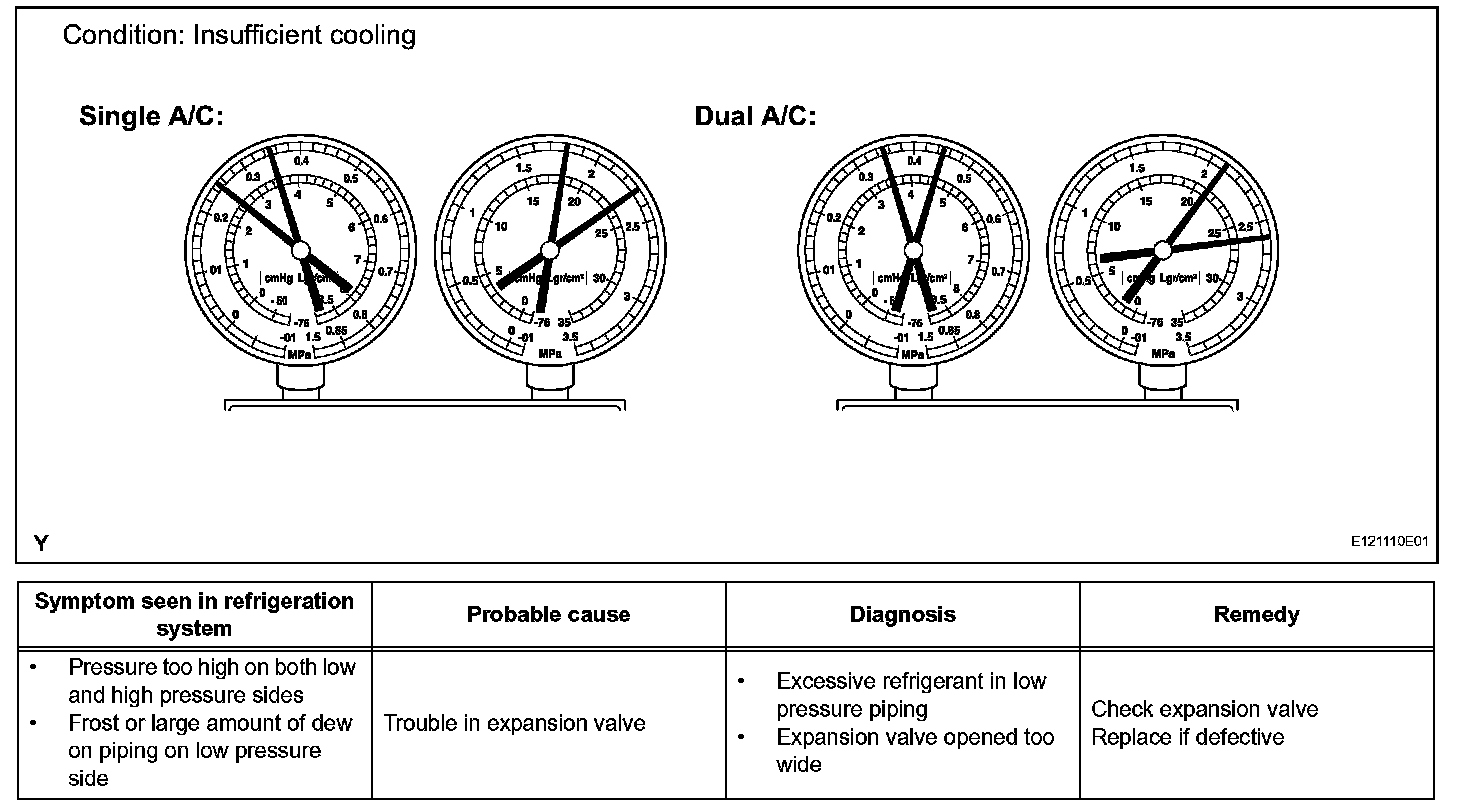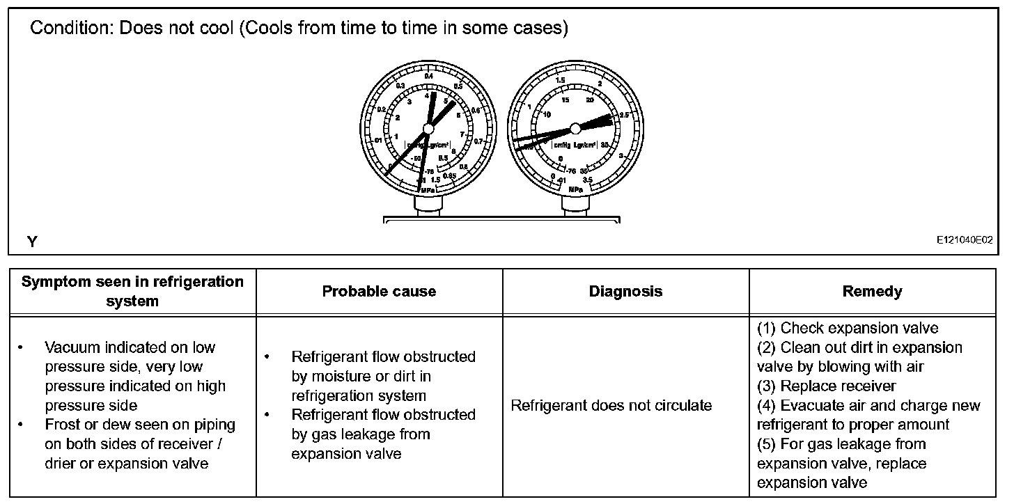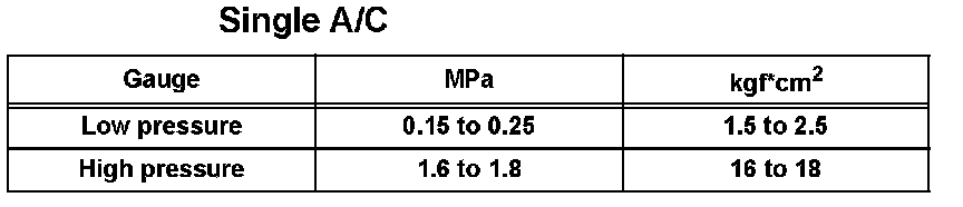 - Make sure that there is some refrigerant remaining in the refrigeration system. When the compressor is OFF: approx. 392 to 588 kPa (4 to 6 kgf/sq.cm, 57 to 85 psi)