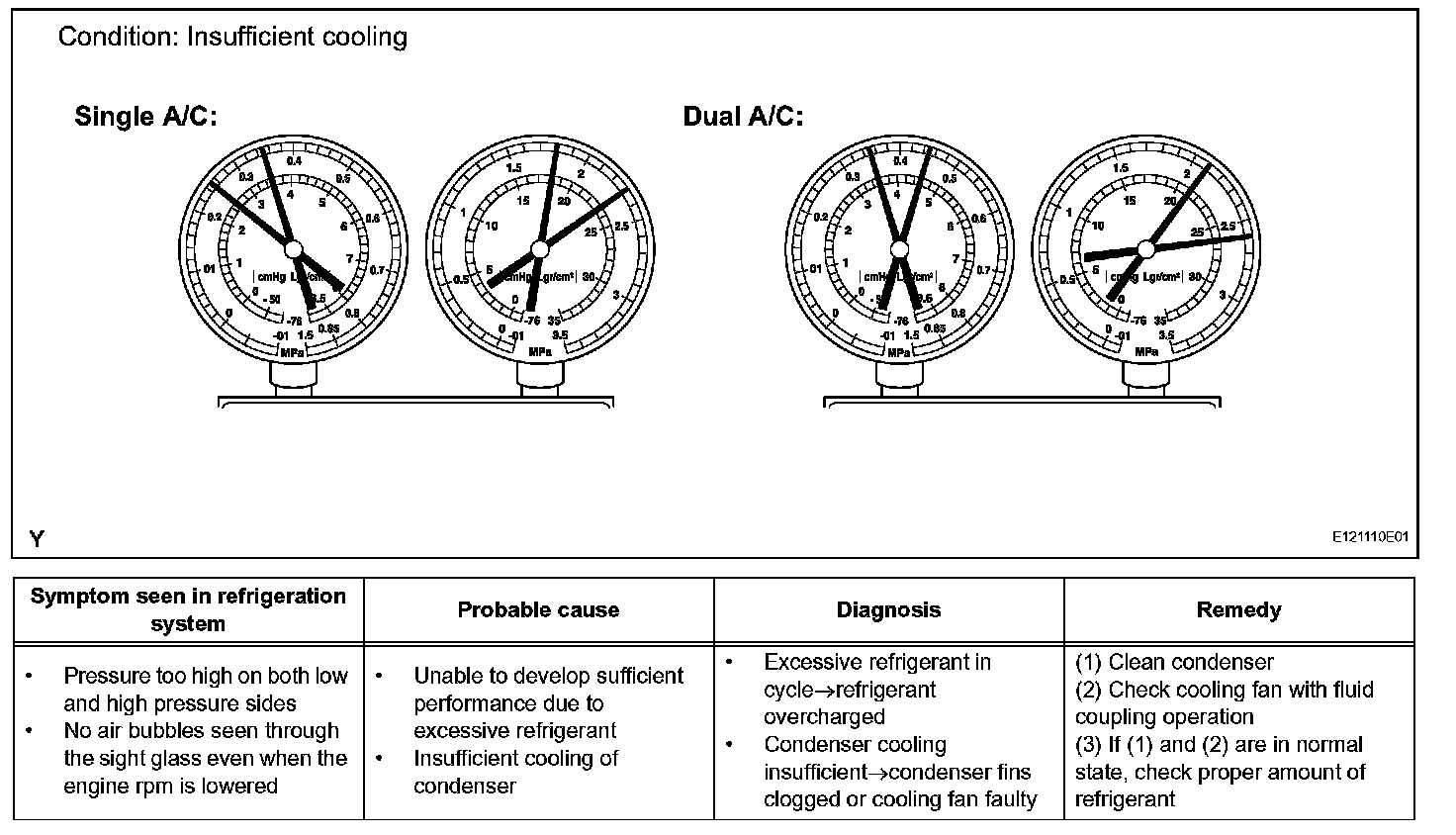 6. Refrigerant overcharged or insufficient cooling of condenser