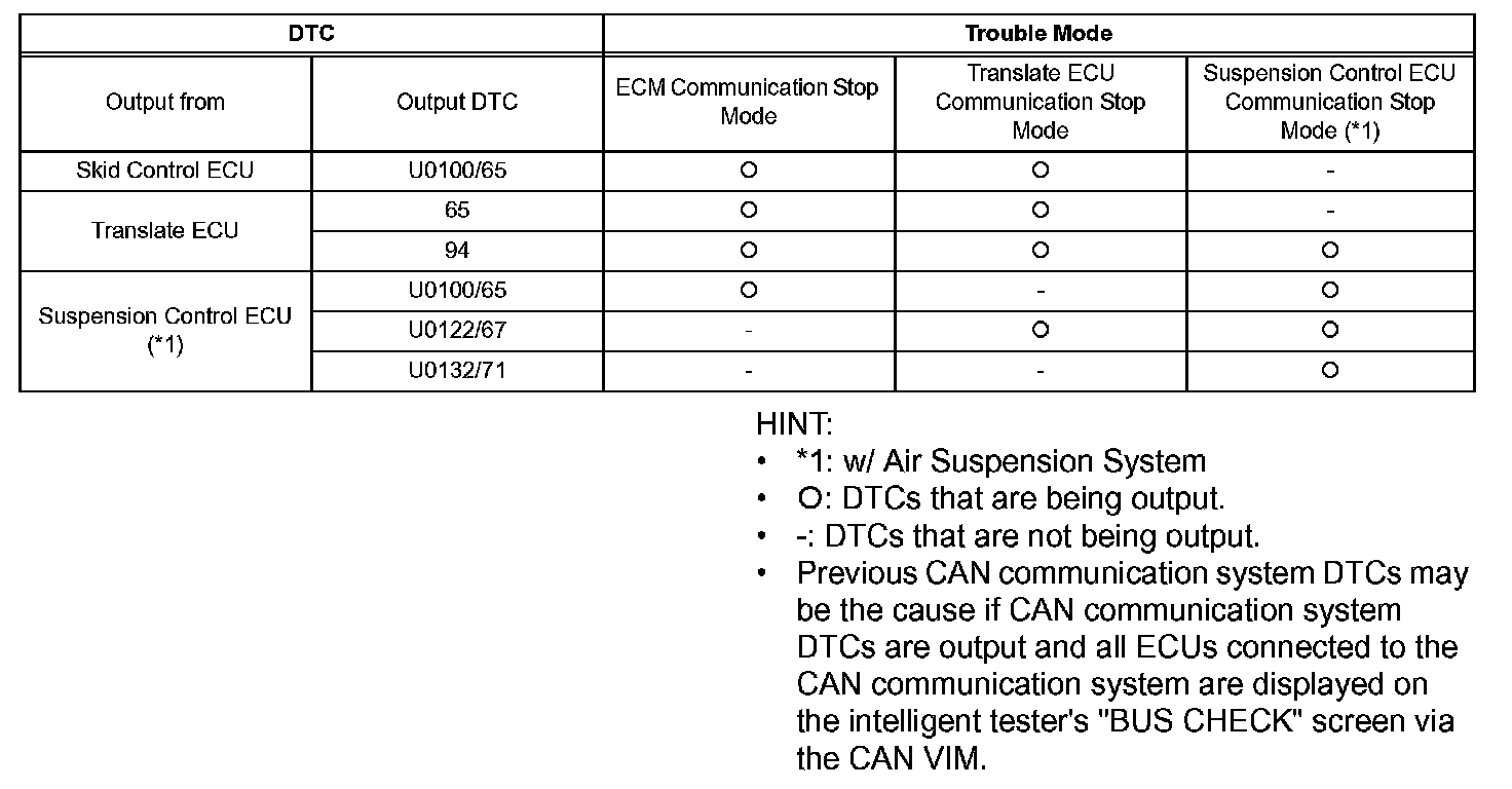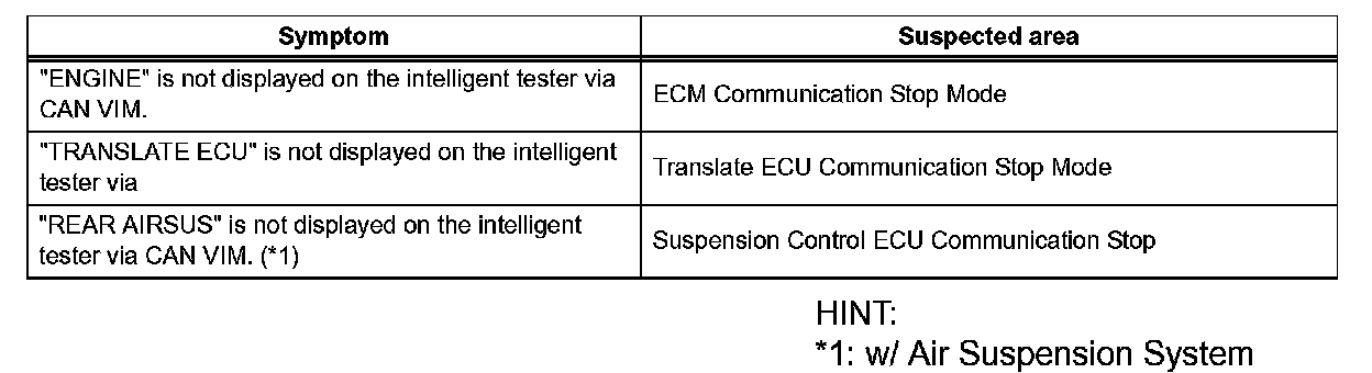 b. Check the communication stop mode of the ECUs not displayed among the following: "ENGINE", "TRANSLATE ECU", or "REAR AIRSUS".