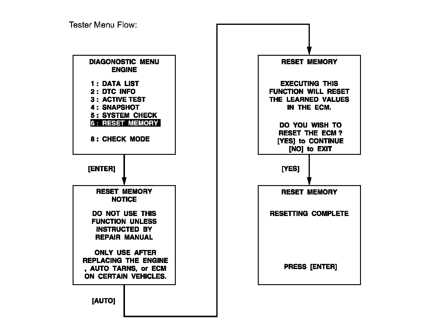 CAUTION: After performing the RESET MEMORY procedures, be sure to perform the ROAD TEST as described earlier. Road Test