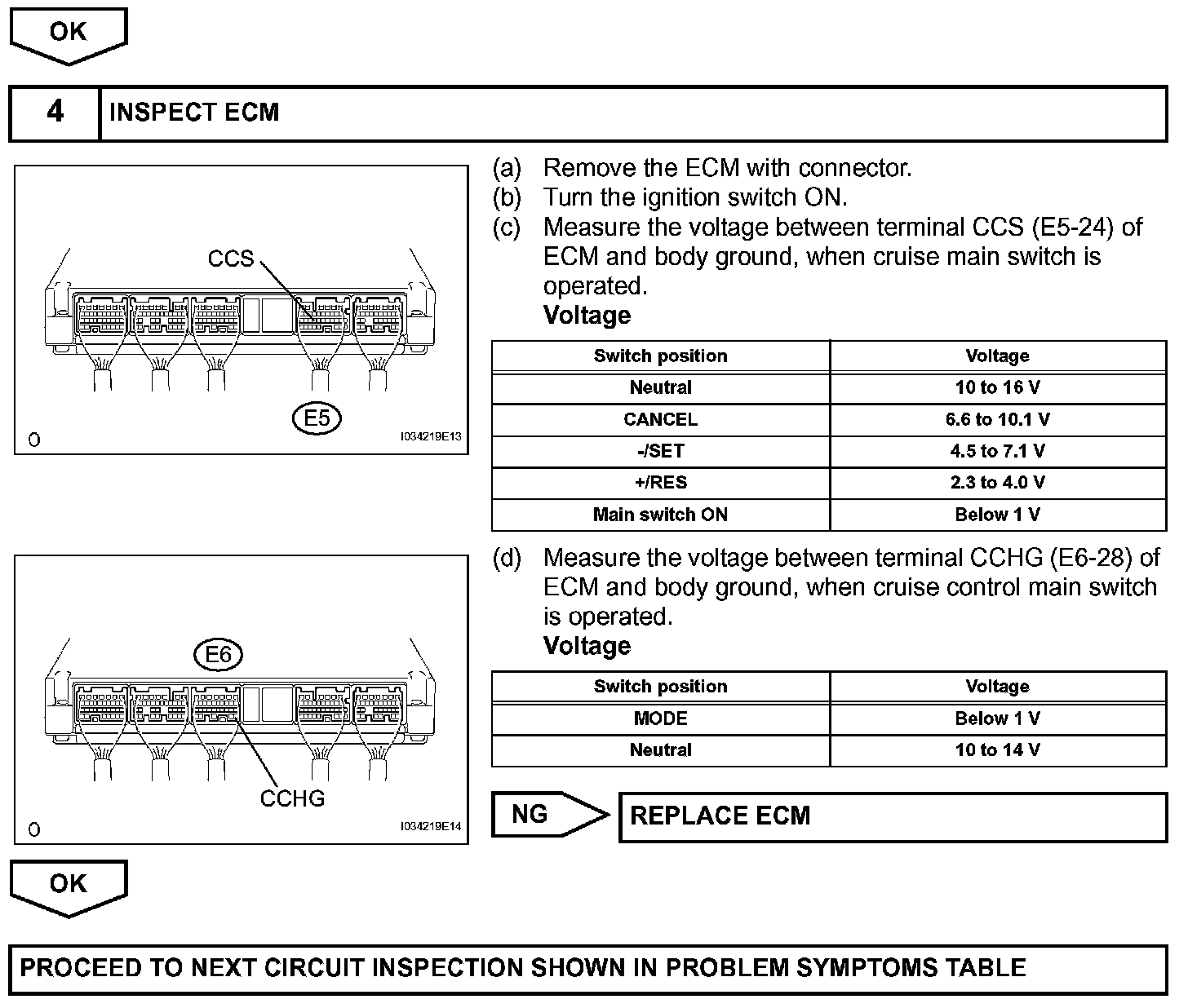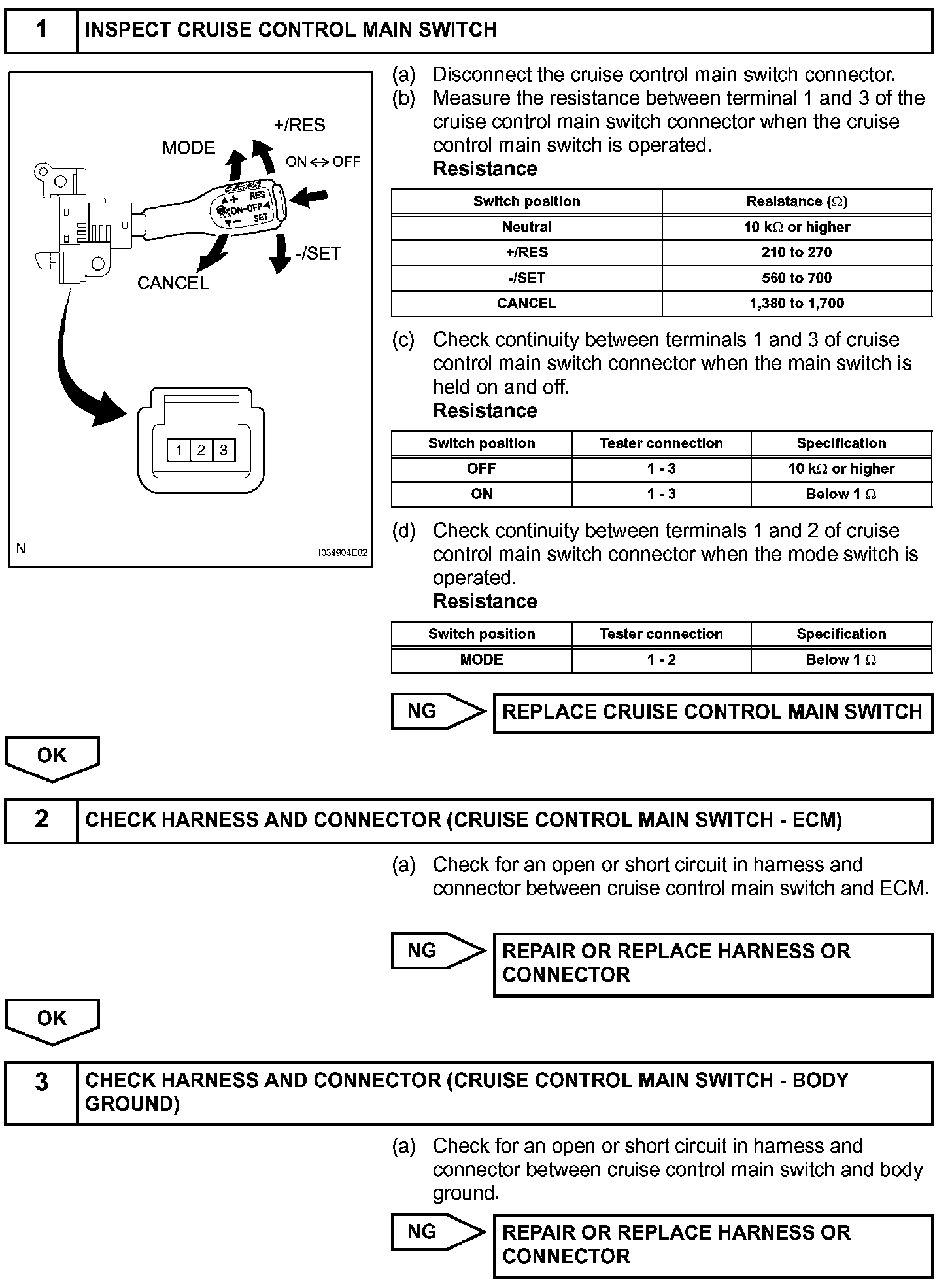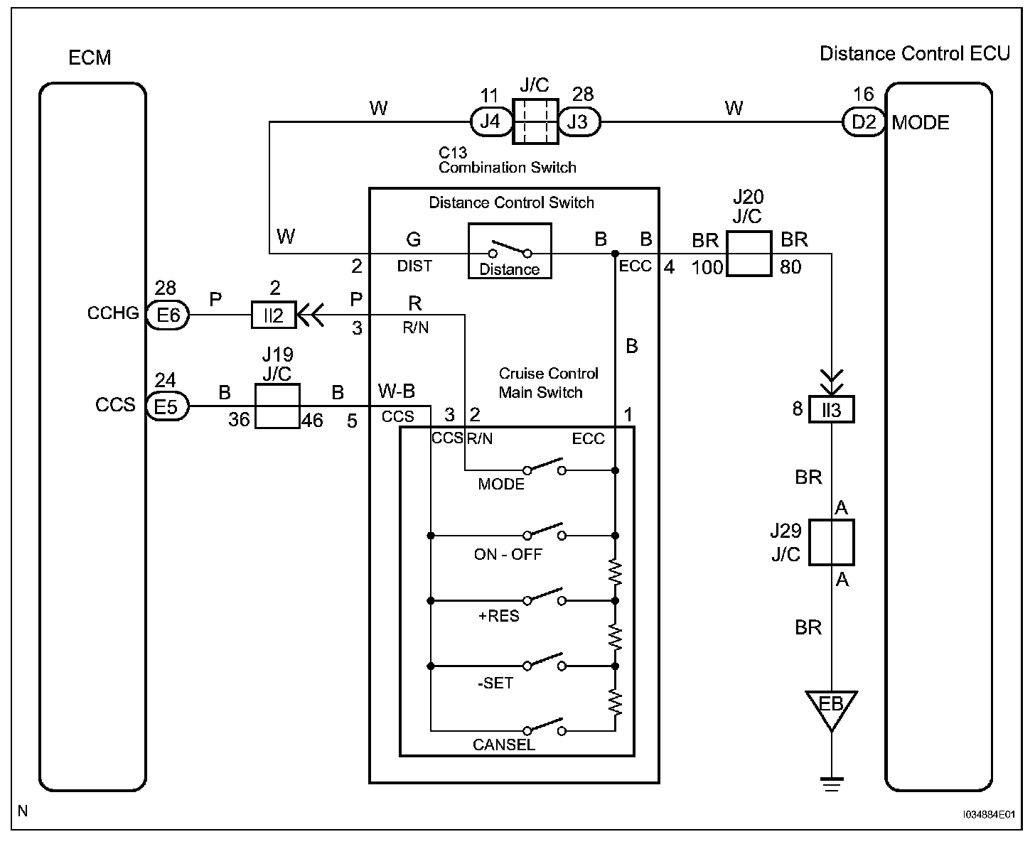 This circuit carries the -/SET, +/RES, MODE and CANCEL signals (each voltage) to the ECM. The mode switch on cruise control main switch changes the vehicle-to-vehicle mode to constant speed control mode.
