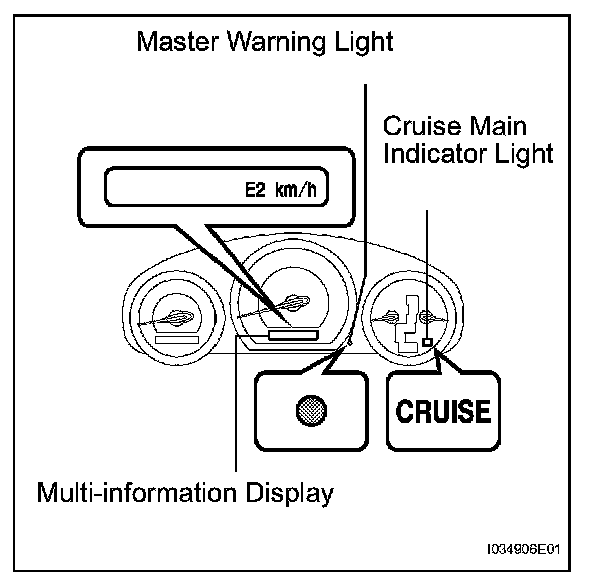 a. The cruise main indicator keeps blinking until turning the main switch off, the master warning light comes on with the warning sound "Pop", and the display shows "E3". The cruise control operation is suspended until turning the main switch to ON again. The auto cancel function deletes the stored vehicle speed and cancels the cruise control operation in the following conditions.