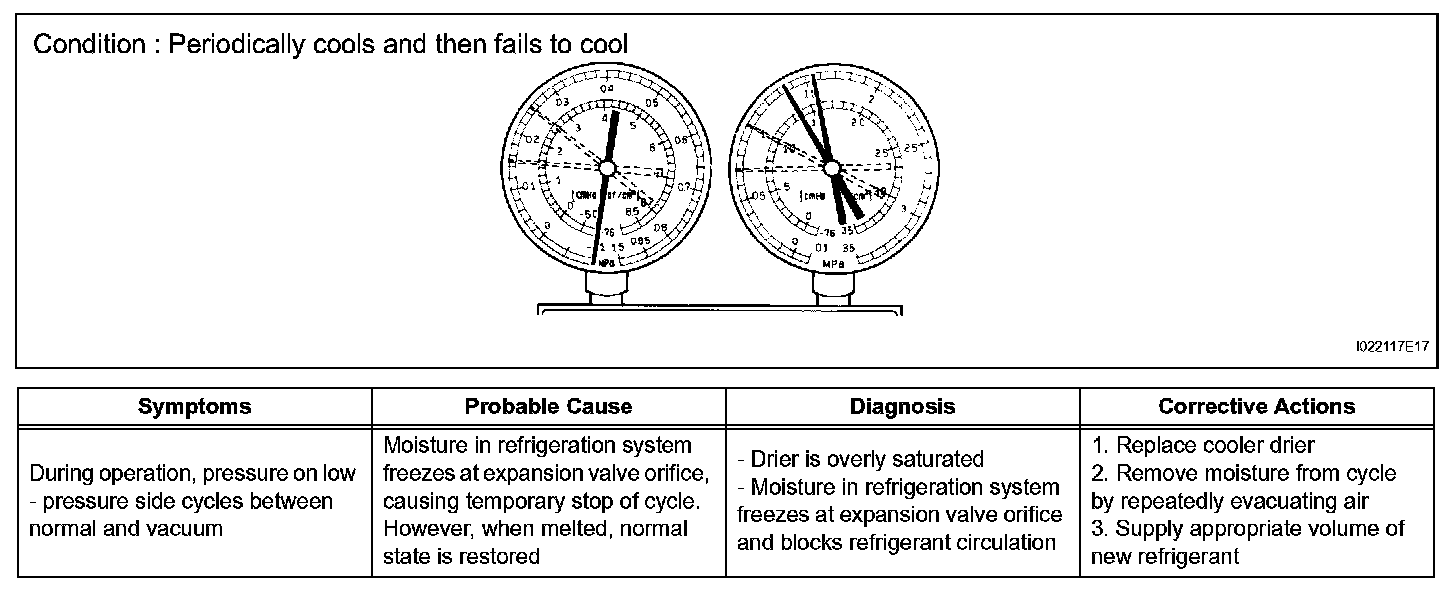 2. The A/C system periodically changes between normal and improper function due to moisture in the refrigerant system.