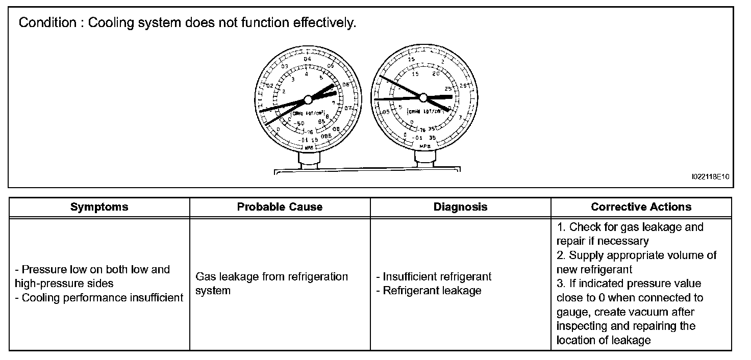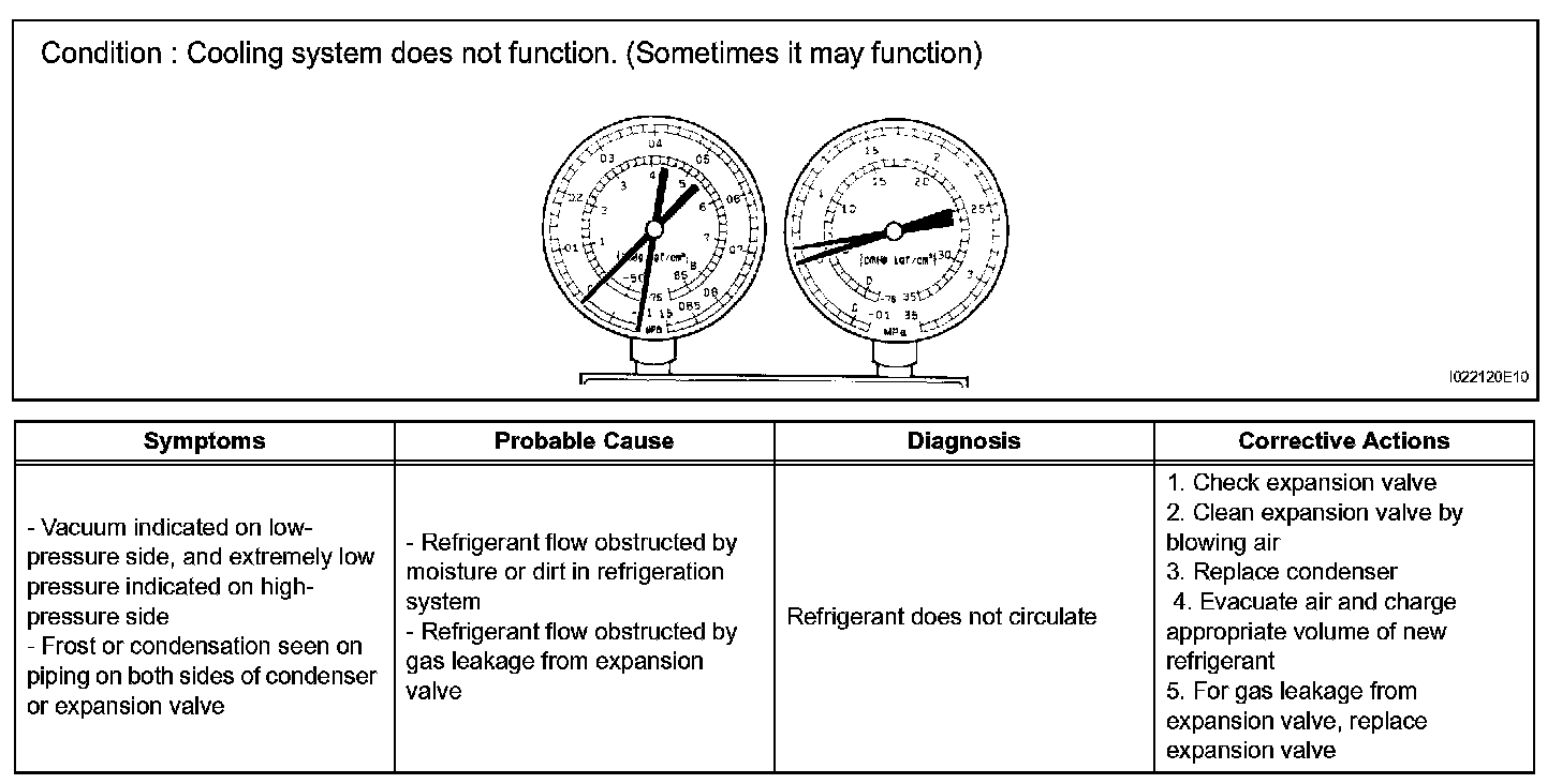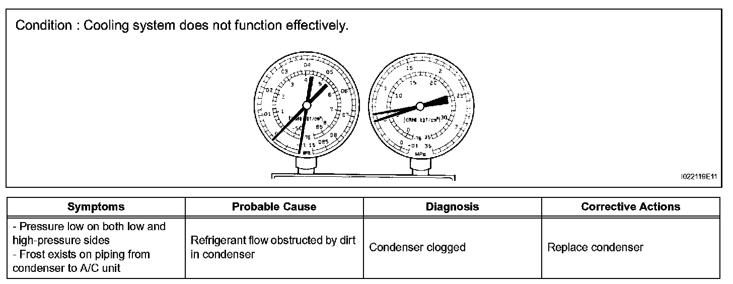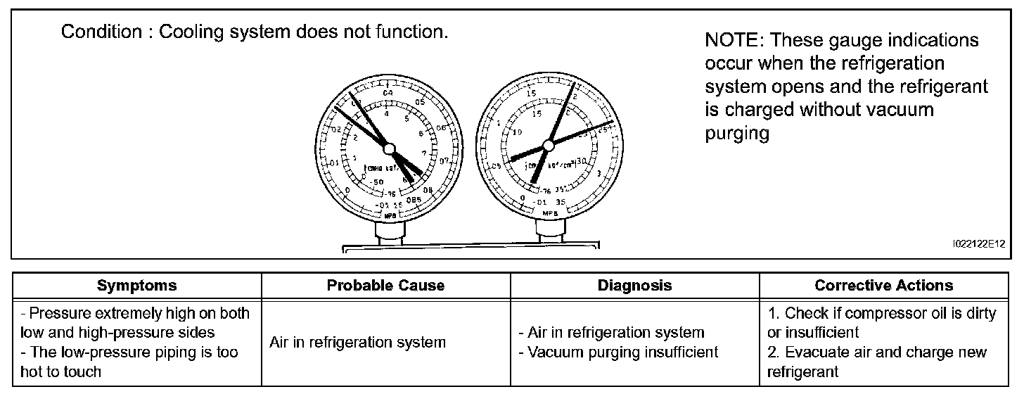 7. The A/C system does not function due to air in the refrigeration system.