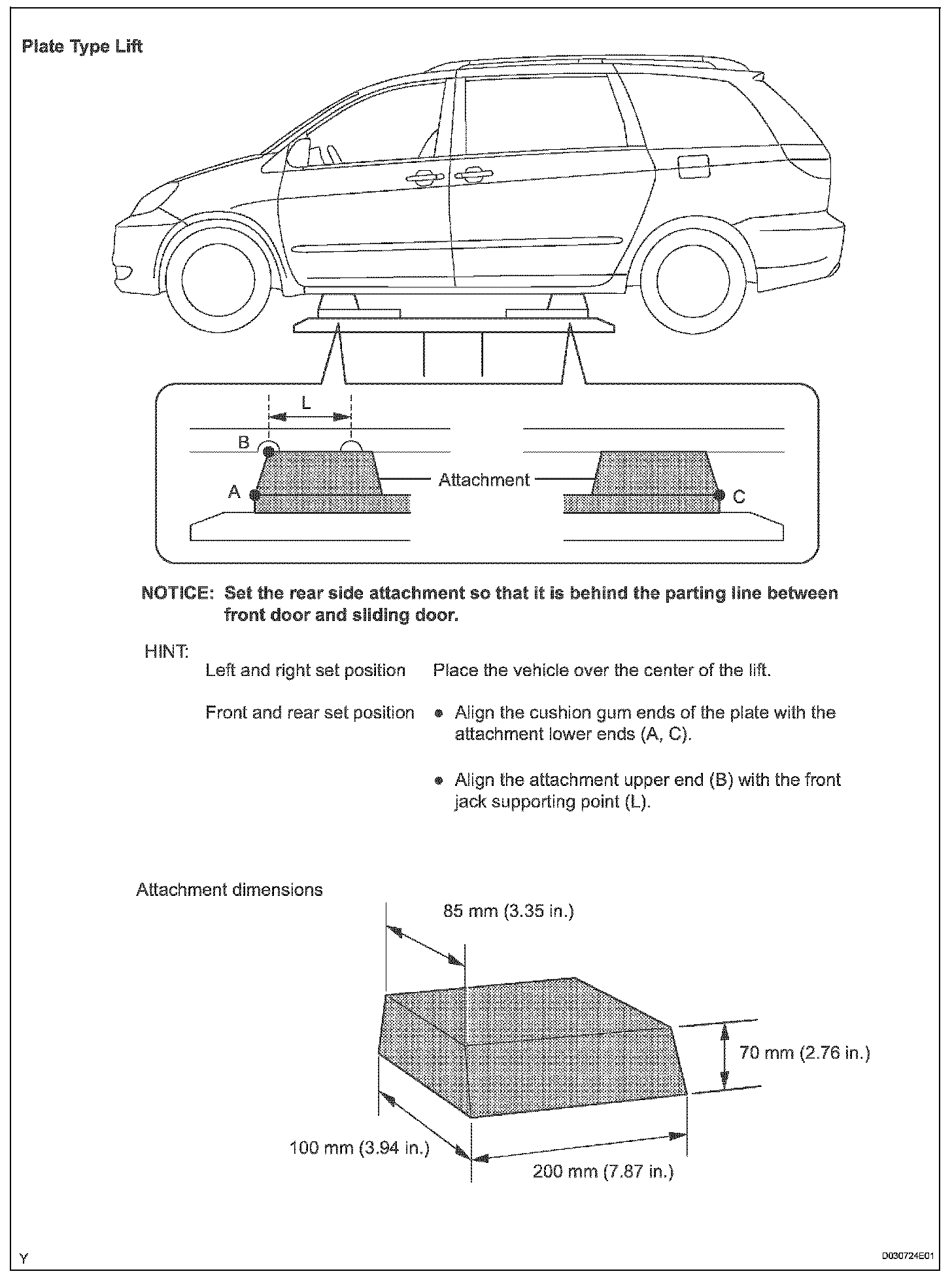 - Do not use a plate-type lift, especially a plate-type lift attachment. If a plate-type lift is used, the vehicle body may be deformed, the vehicle may not remain stabilized, or the undercover of the vehicle or other parts may be damaged.