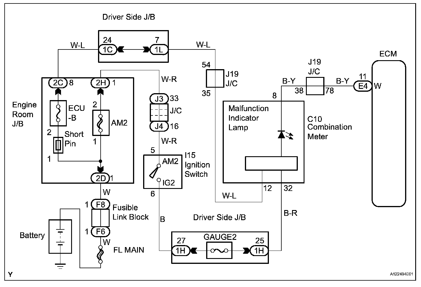 The MIL (Malfunction Indicator Lamp) is used to indicate vehicle malfunction detections by the ECM. By turning the ignition switch ON, power is supplied to the MIL circuit, and the ECM provides the circuit ground which illuminates the MIL.