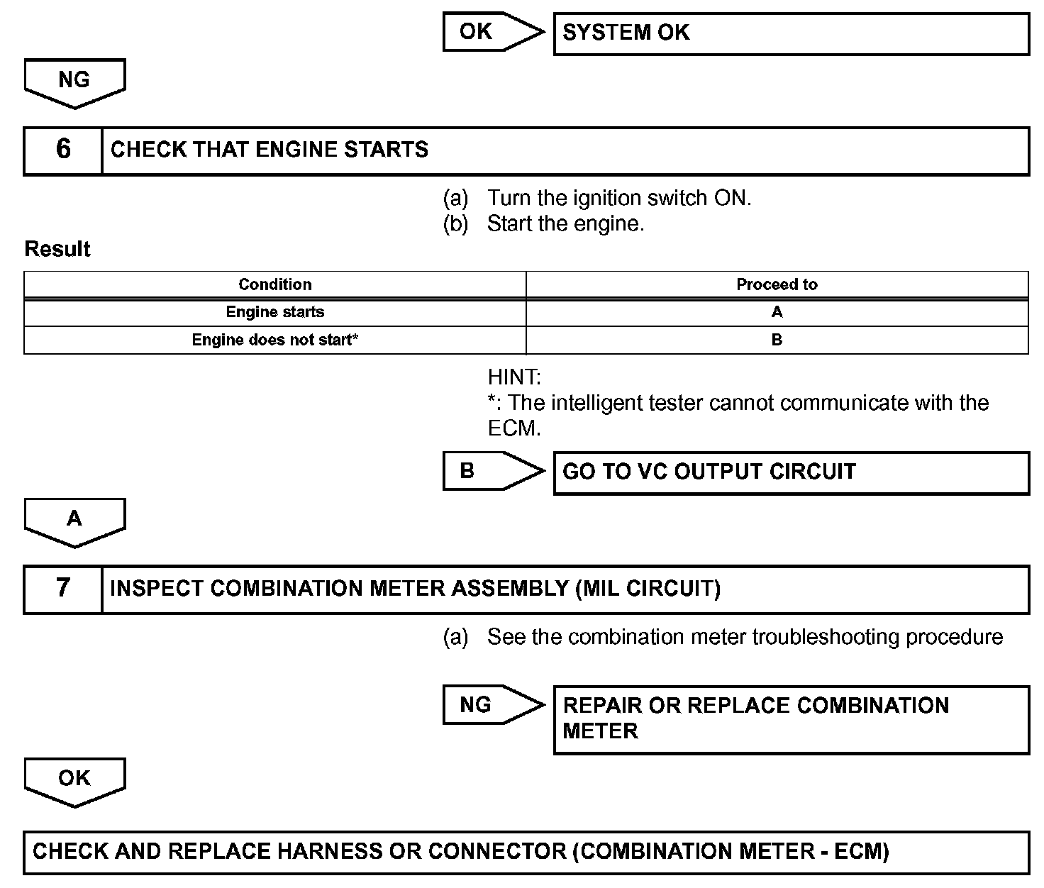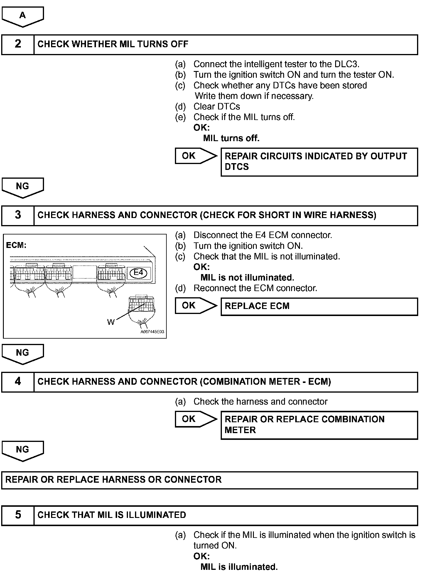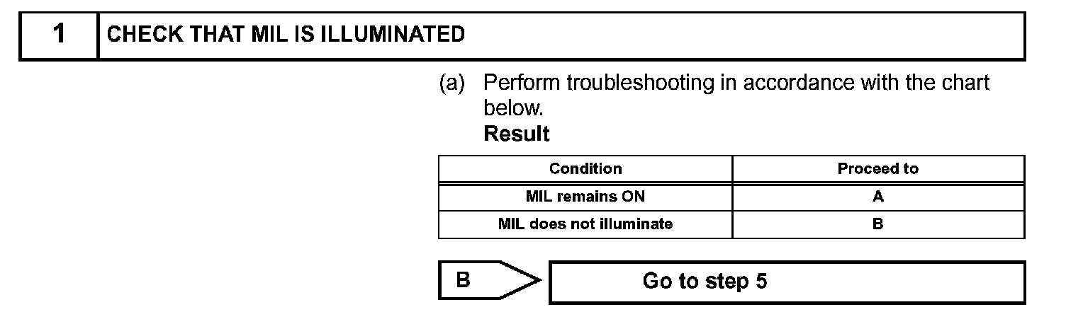The MIL operation can be checked visually: When the ignition switch is first turned ON, the MIL should be illuminated and should then turn OFF. If the MIL remains illuminated or is not illuminated, conduct the following troubleshooting procedure using the intelligent tester.