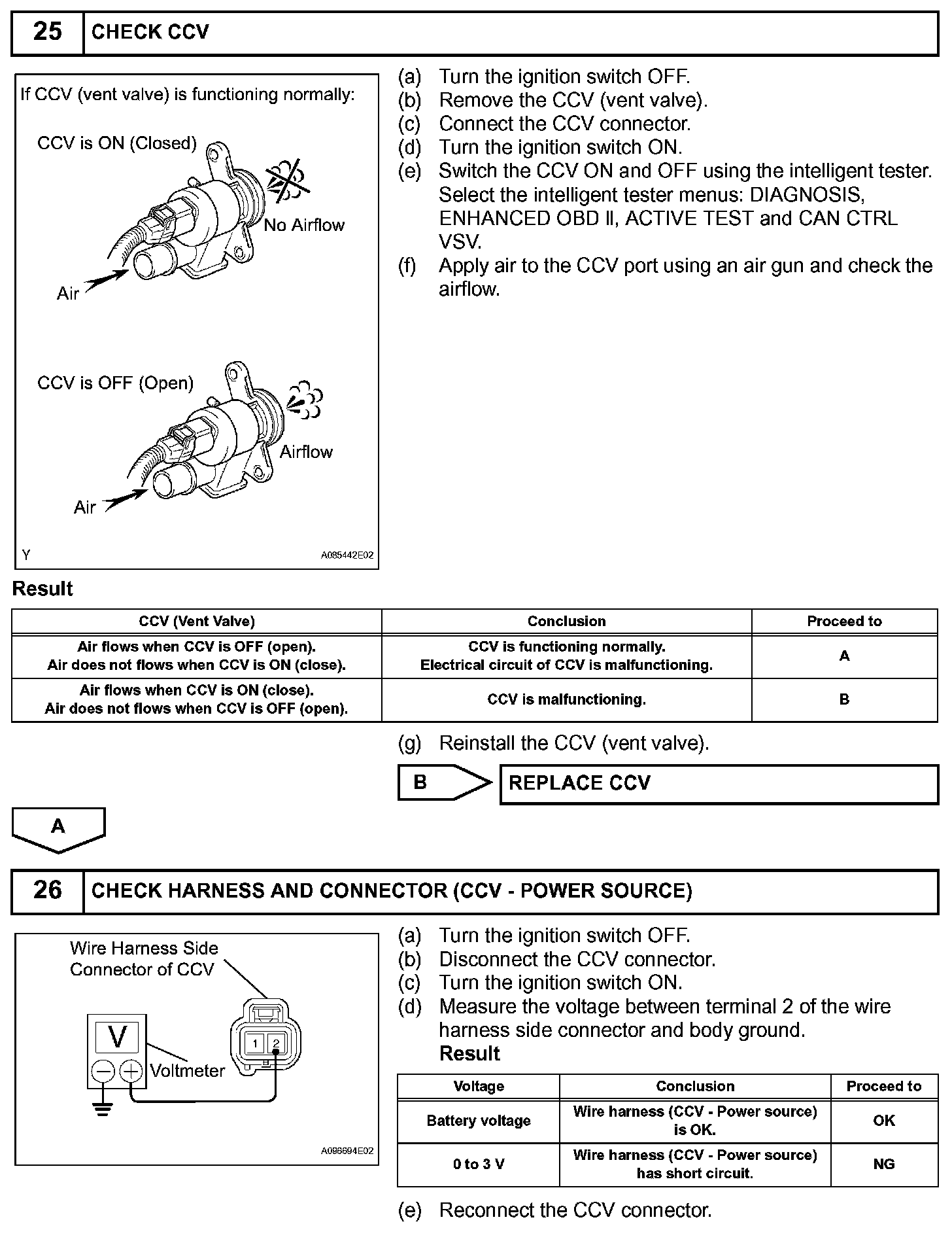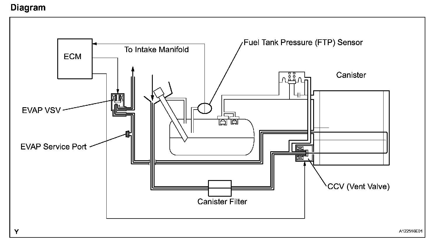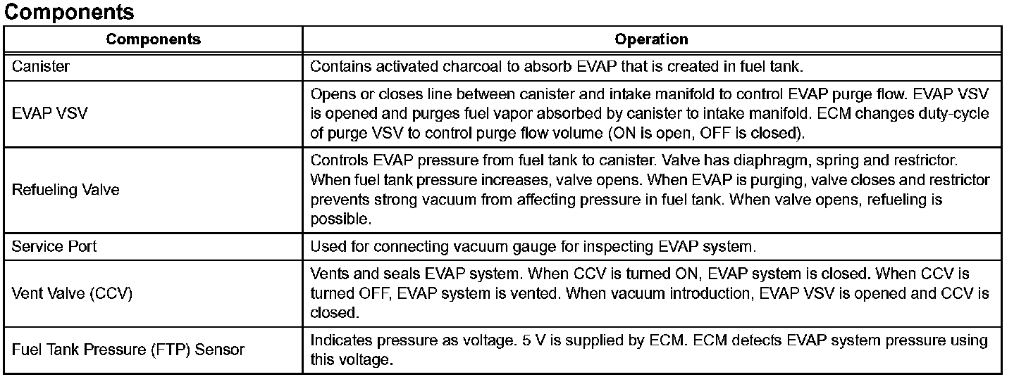 When predetermined conditions (closed loop, etc.) are met, the EVAP VSV is opened and stored fuel vapor in the canister is purged to the intake manifold. The ECM changes duty-cycle to the EVAP VSV to control purge flow volume. Purge flow volume is determined by the intake manifold pressure. Atmospheric pressure is allowed into the canister through the vent valve (CCV) to ensure that purge flow is maintained when negative pressure (vacuum) is applied to the canister. This EVAP system contains components:
