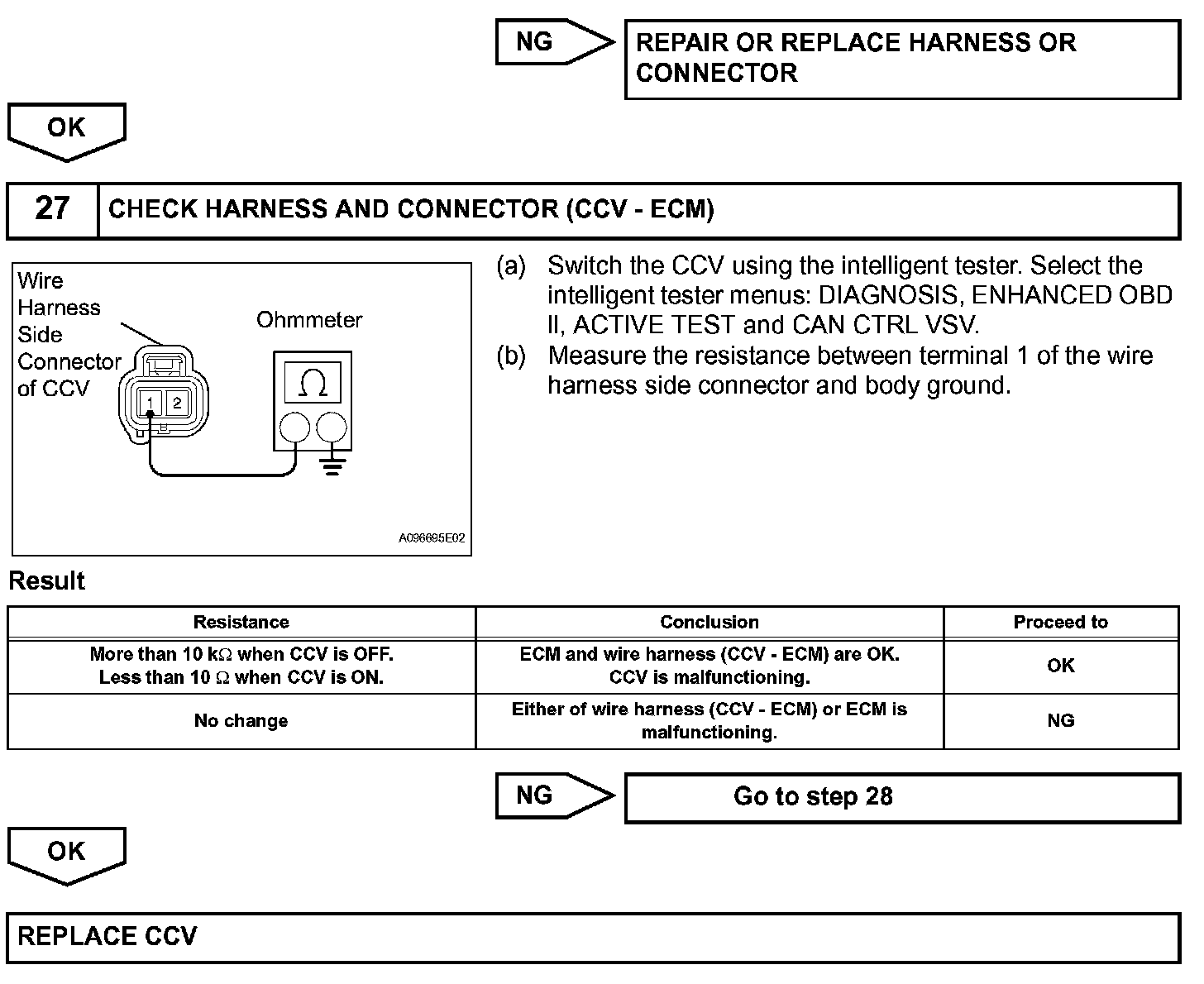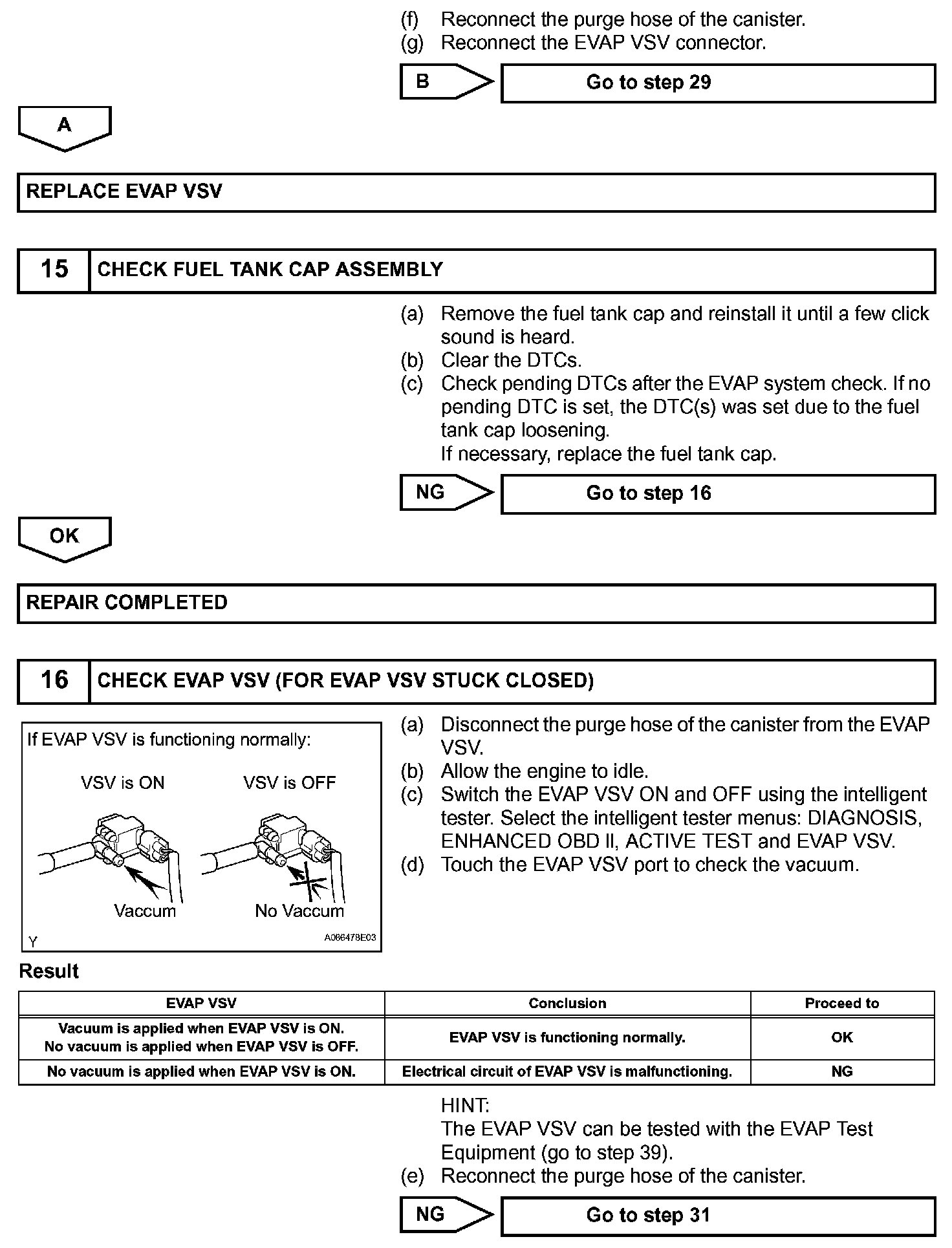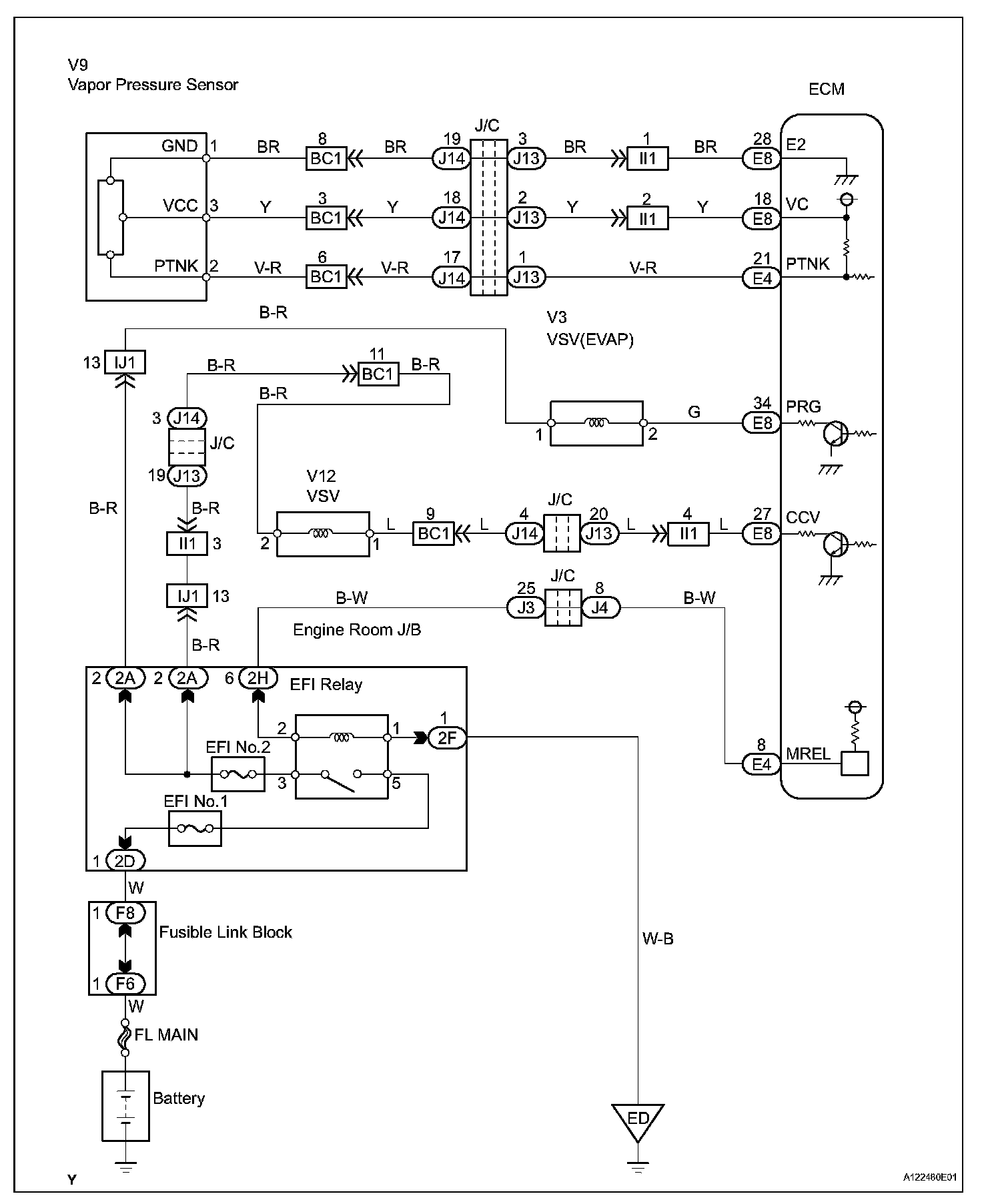 When predetermined conditions (closed loop, etc.) are met, the EVAP VSV is opened and stored fuel vapor in the canister is purged to the intake manifold. The ECM changes duty-cycle to the EVAP VSV to control purge flow volume. Purge flow volume is determined by the intake manifold pressure. Atmospheric pressure is allowed into the canister through the vent valve (CCV) to ensure that purge flow is maintained when negative pressure (vacuum) is applied to the canister. This EVAP system contains components: