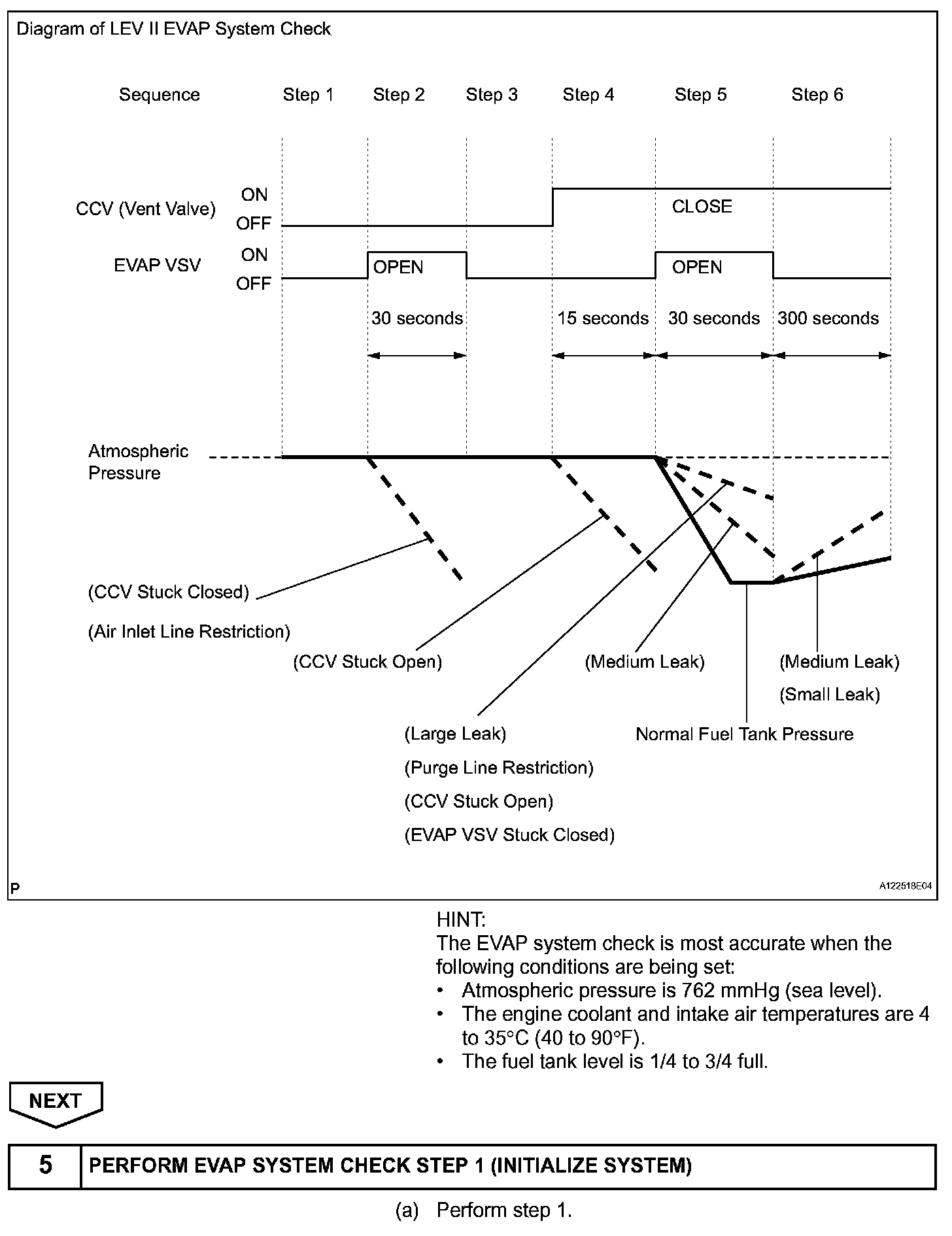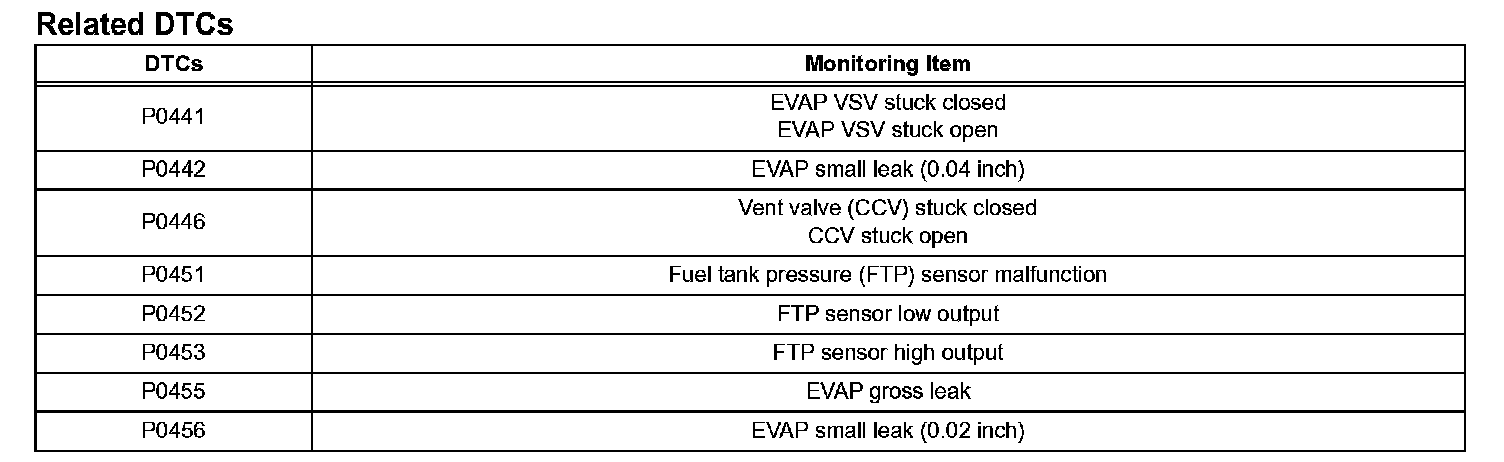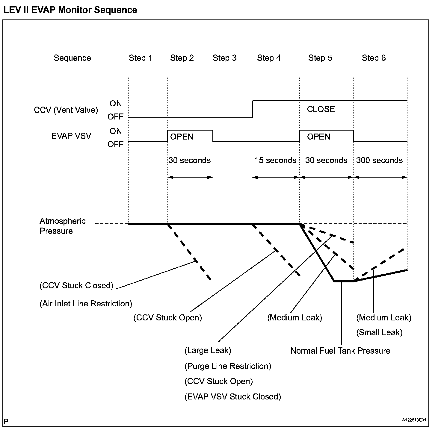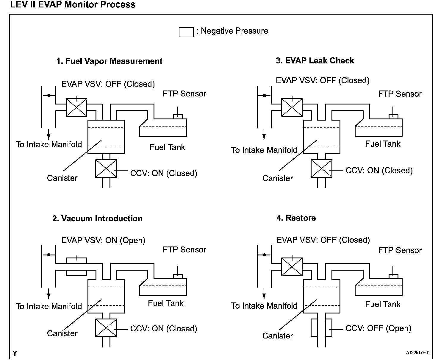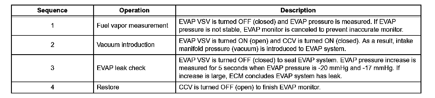 The EVAP monitor's purpose is to check for EVAP leaks and EVAP VSV and CCV malfunctions. The monitor performs the check by first introducing the intake manifold's negative pressure (vacuum) to the EVAP system. Then, the monitor records change in the EVAP system's pressure levels. The monitor runs when the following conditions are met: