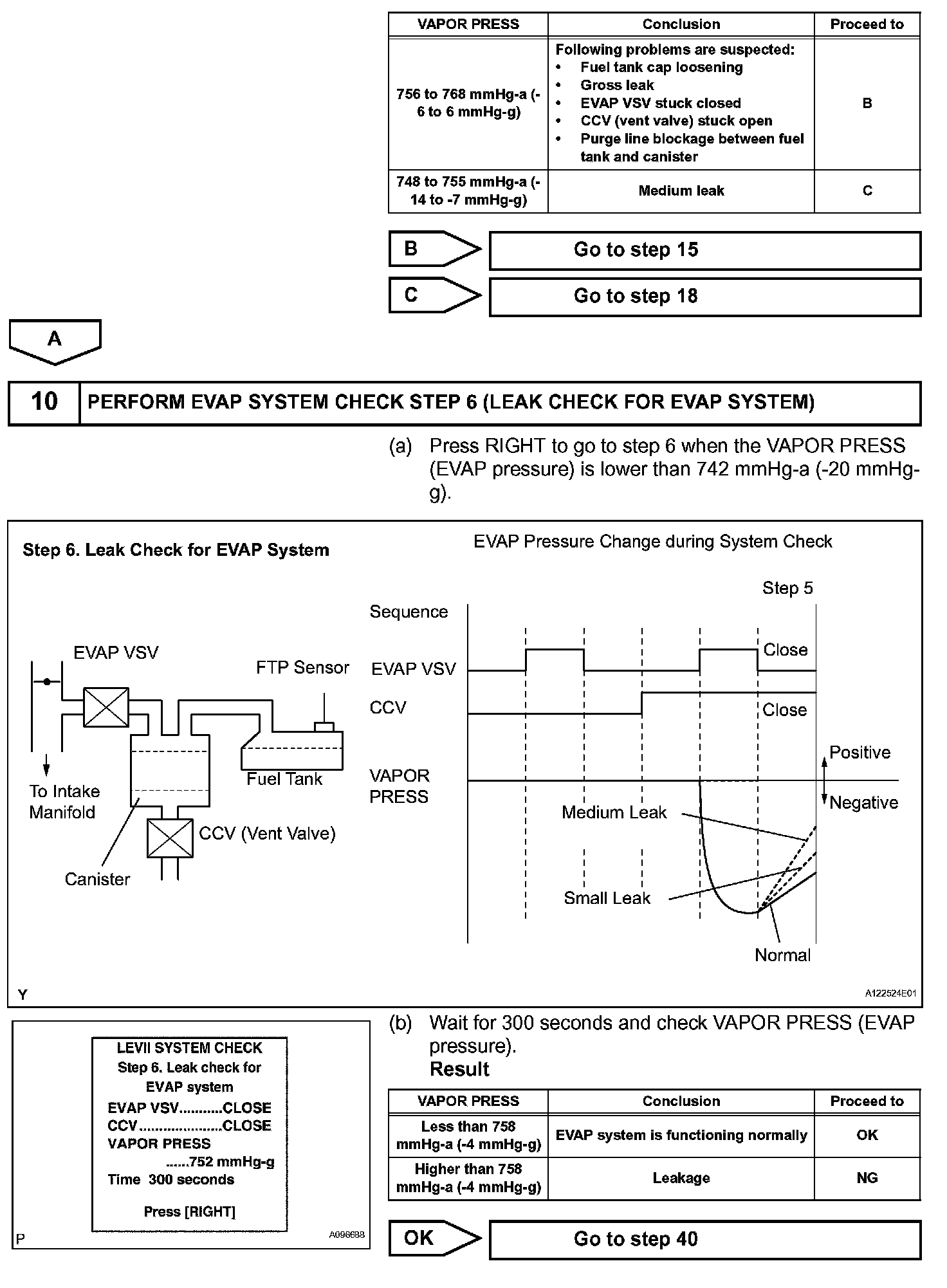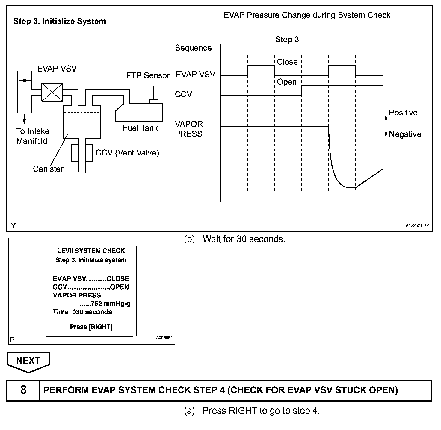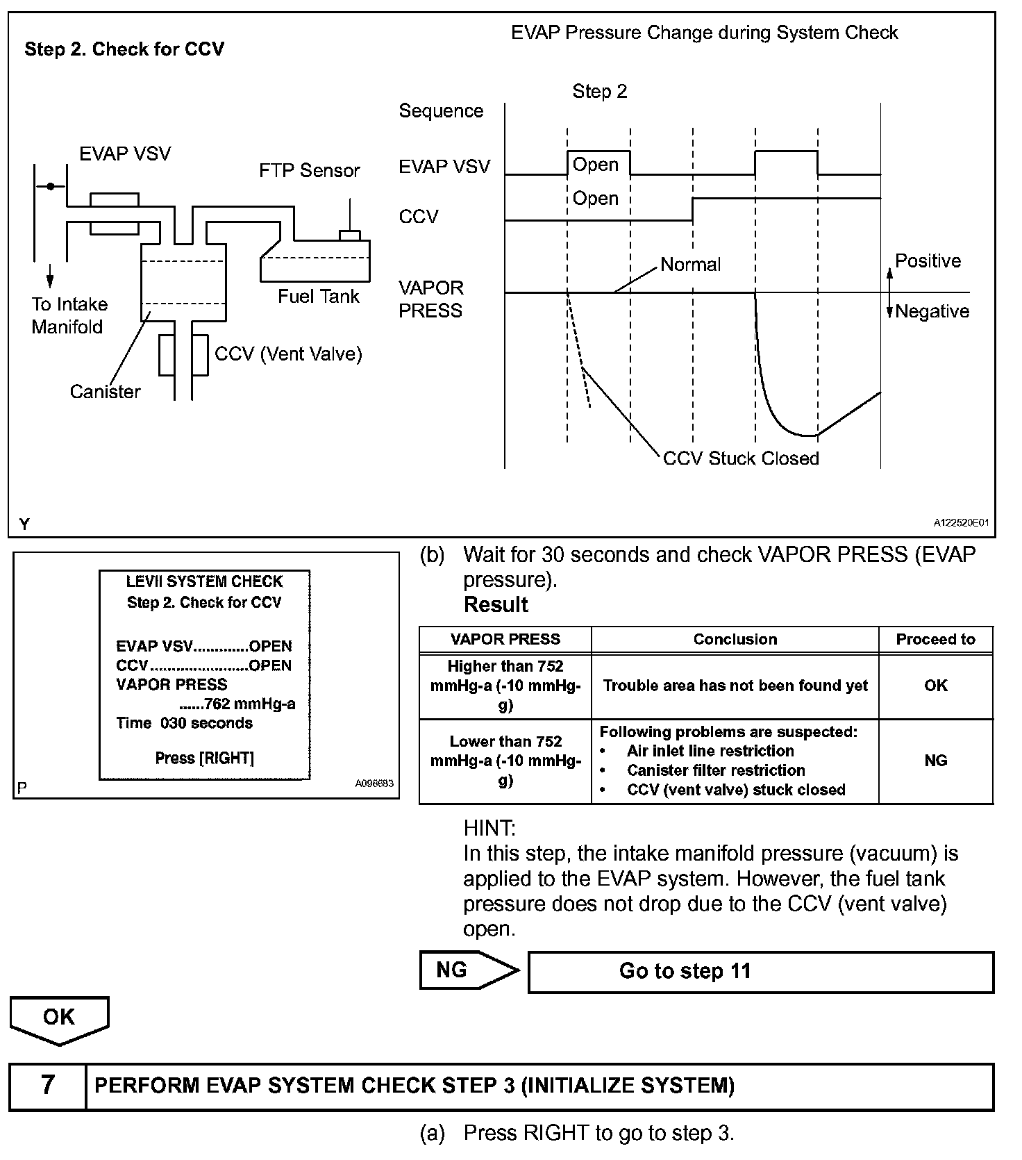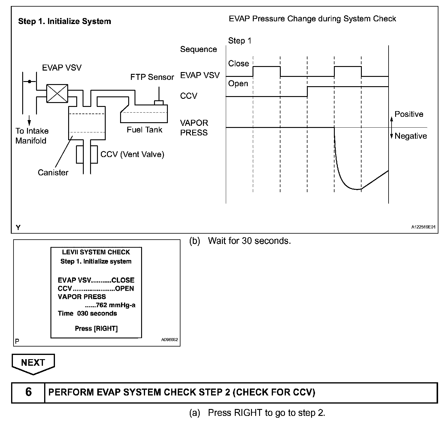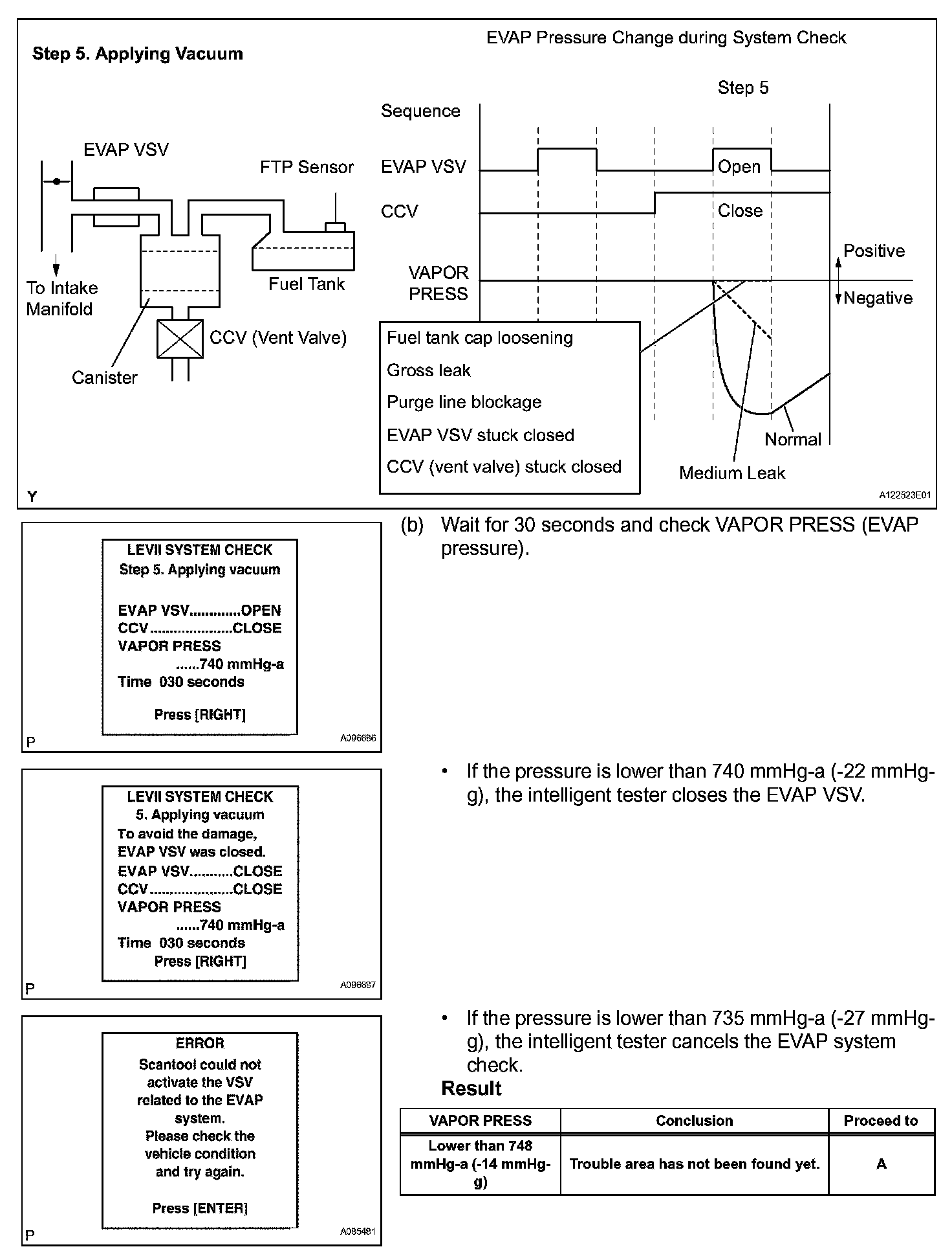 The EVAP monitor's purpose is to check for EVAP leaks and EVAP VSV and CCV malfunctions. The monitor performs the check by first introducing the intake manifold's negative pressure (vacuum) to the EVAP system. Then, the monitor records change in the EVAP system's pressure levels. The monitor runs when the following conditions are met: