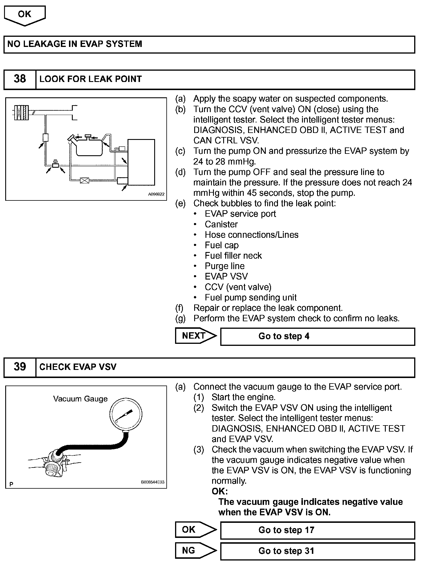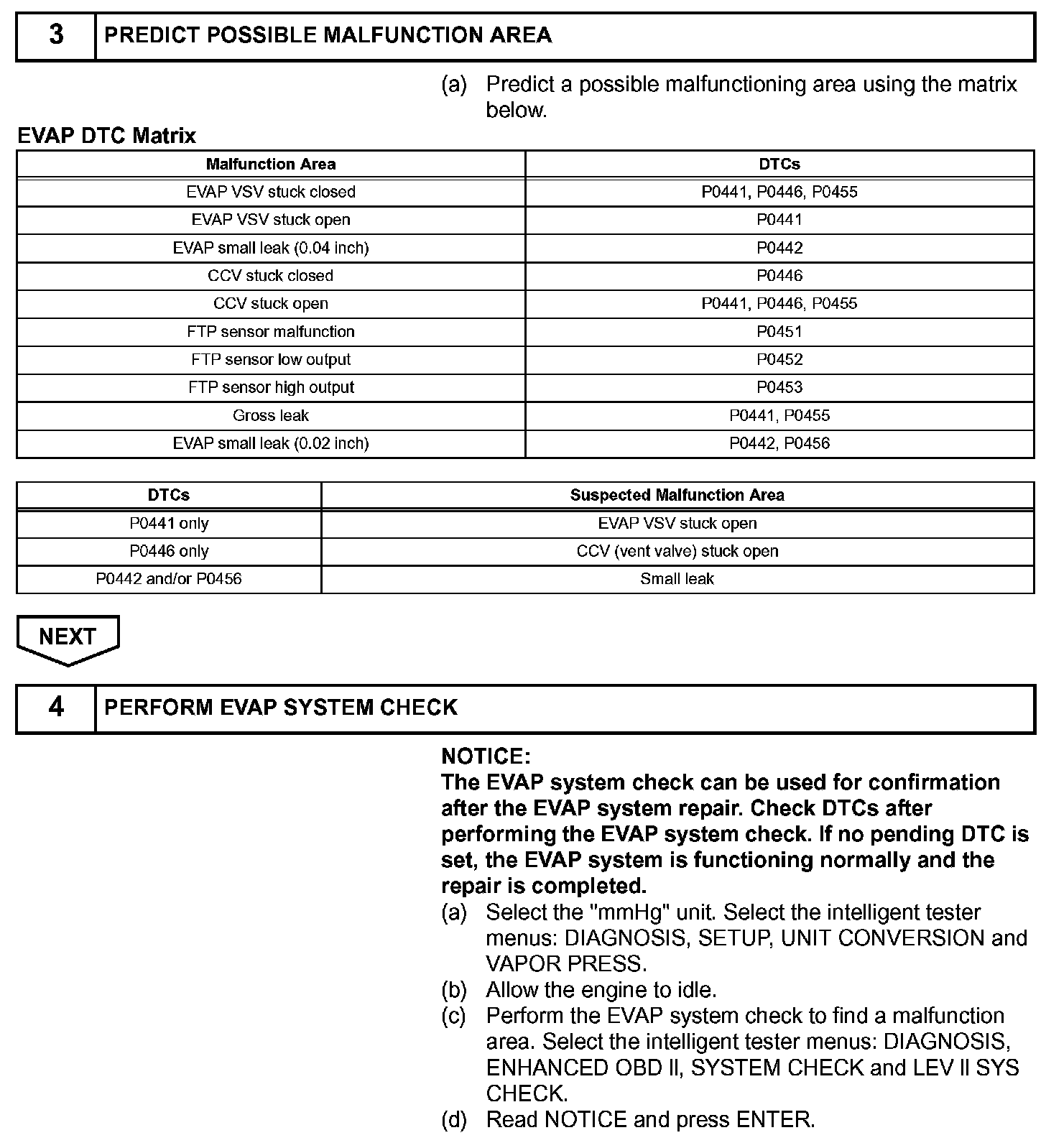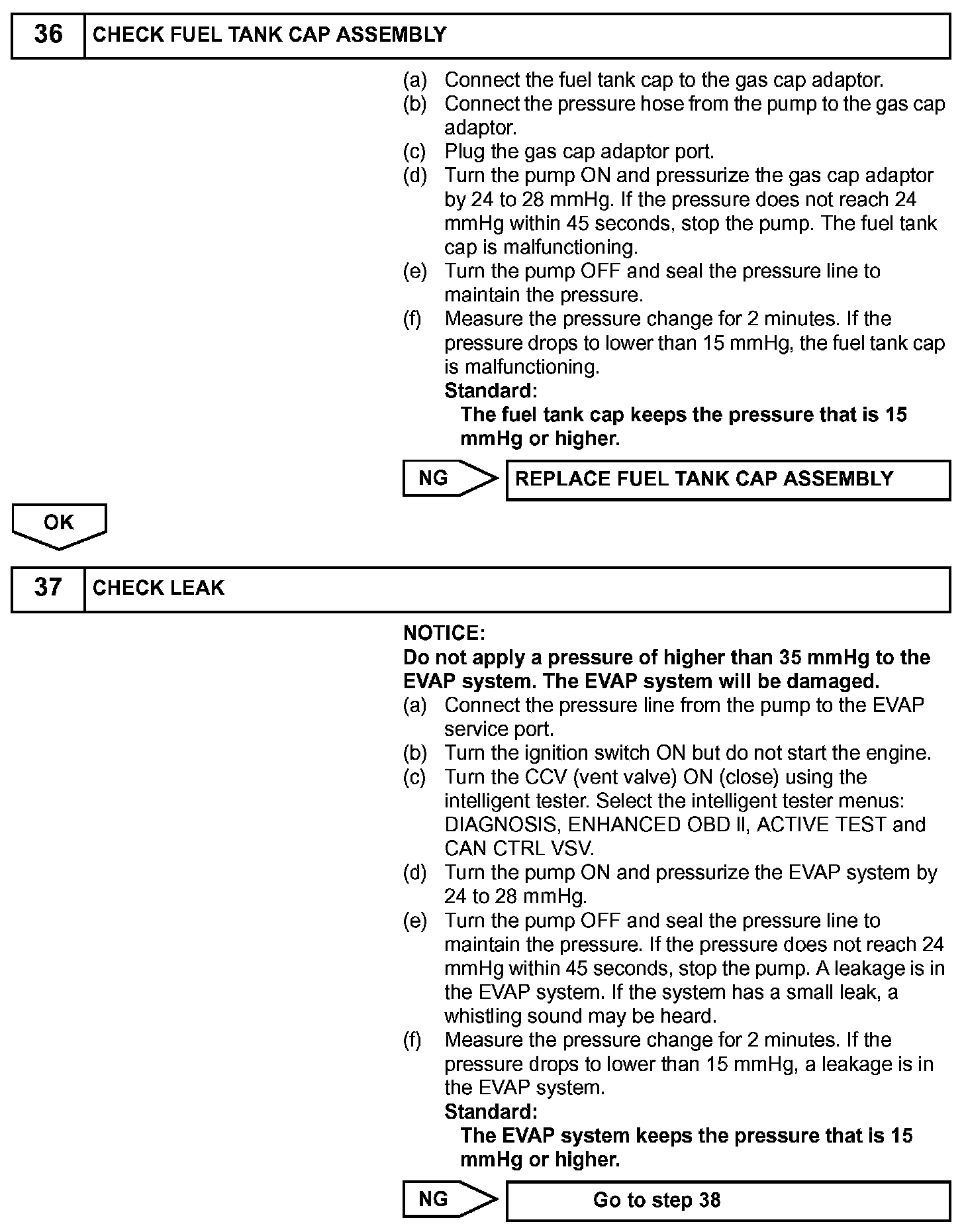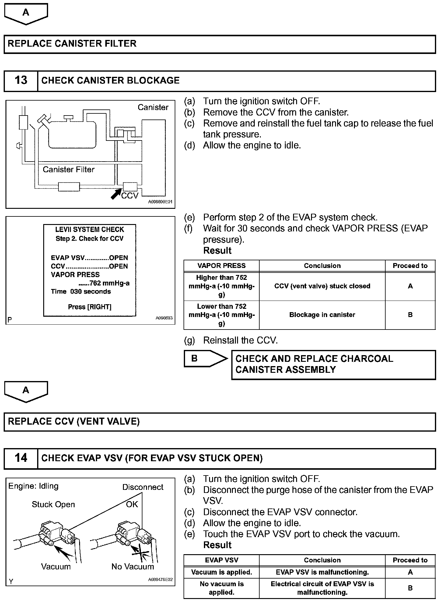 The EVAP monitor's purpose is to check for EVAP leaks and EVAP VSV and CCV malfunctions. The monitor performs the check by first introducing the intake manifold's negative pressure (vacuum) to the EVAP system. Then, the monitor records change in the EVAP system's pressure levels. The monitor runs when the following conditions are met: