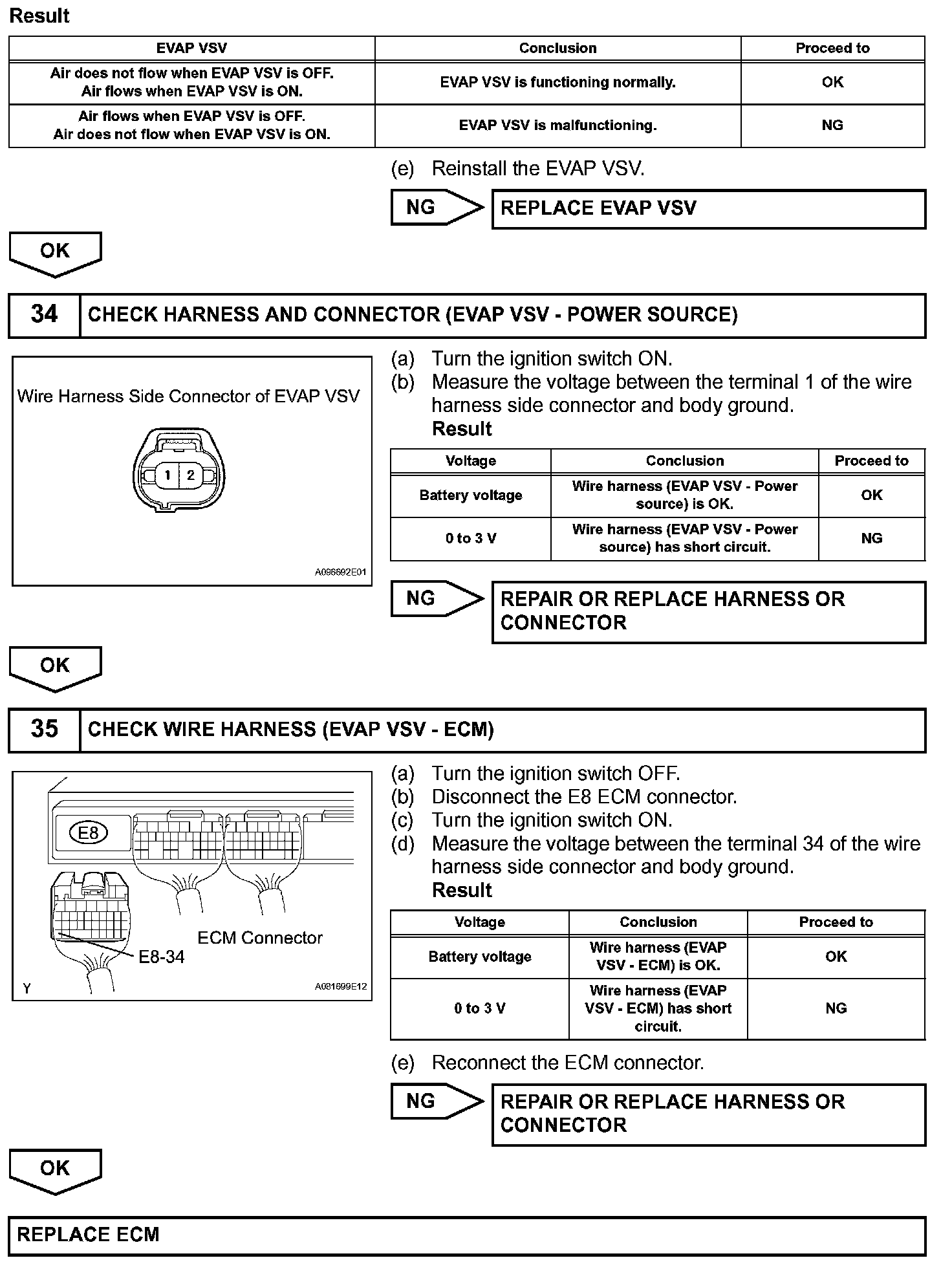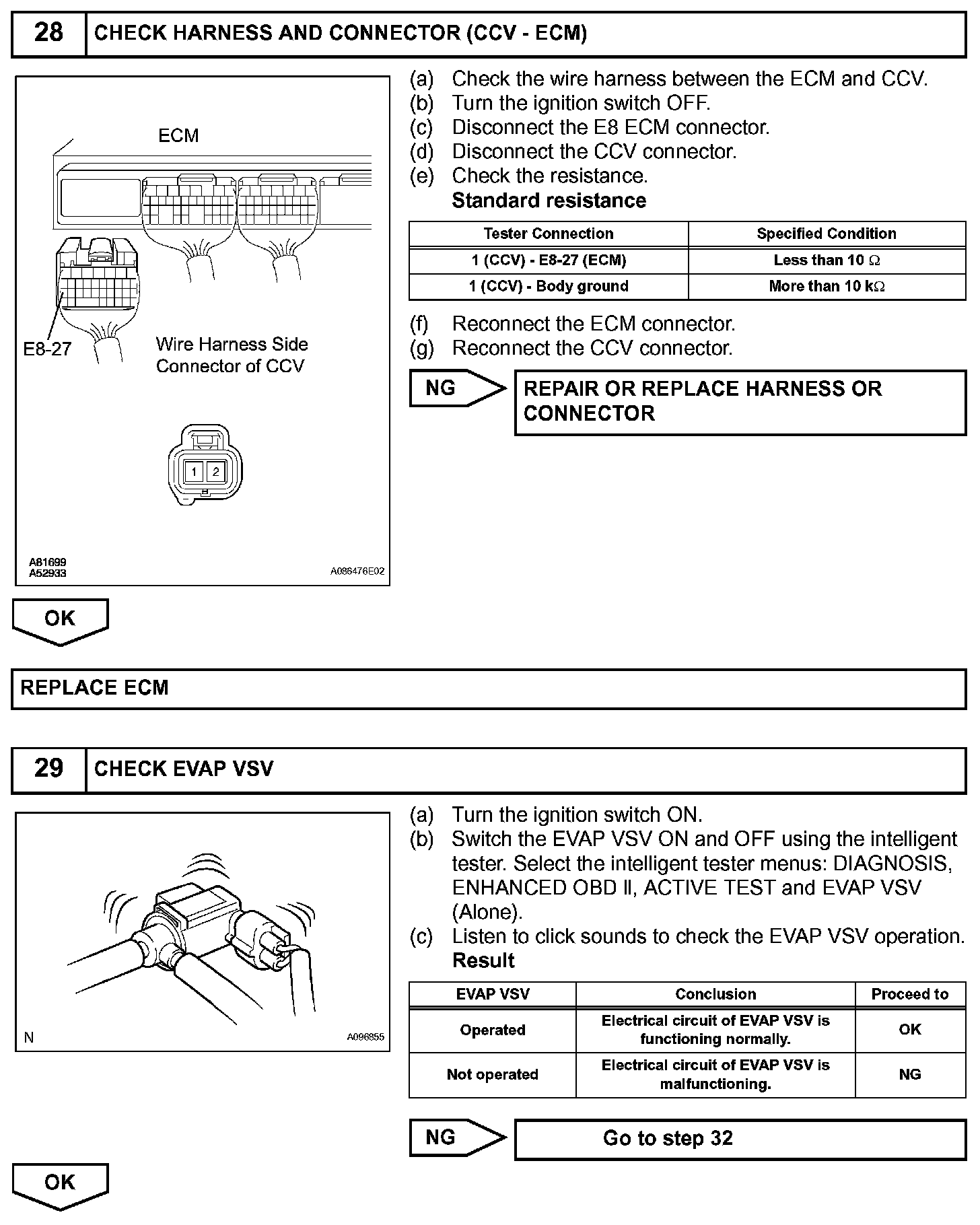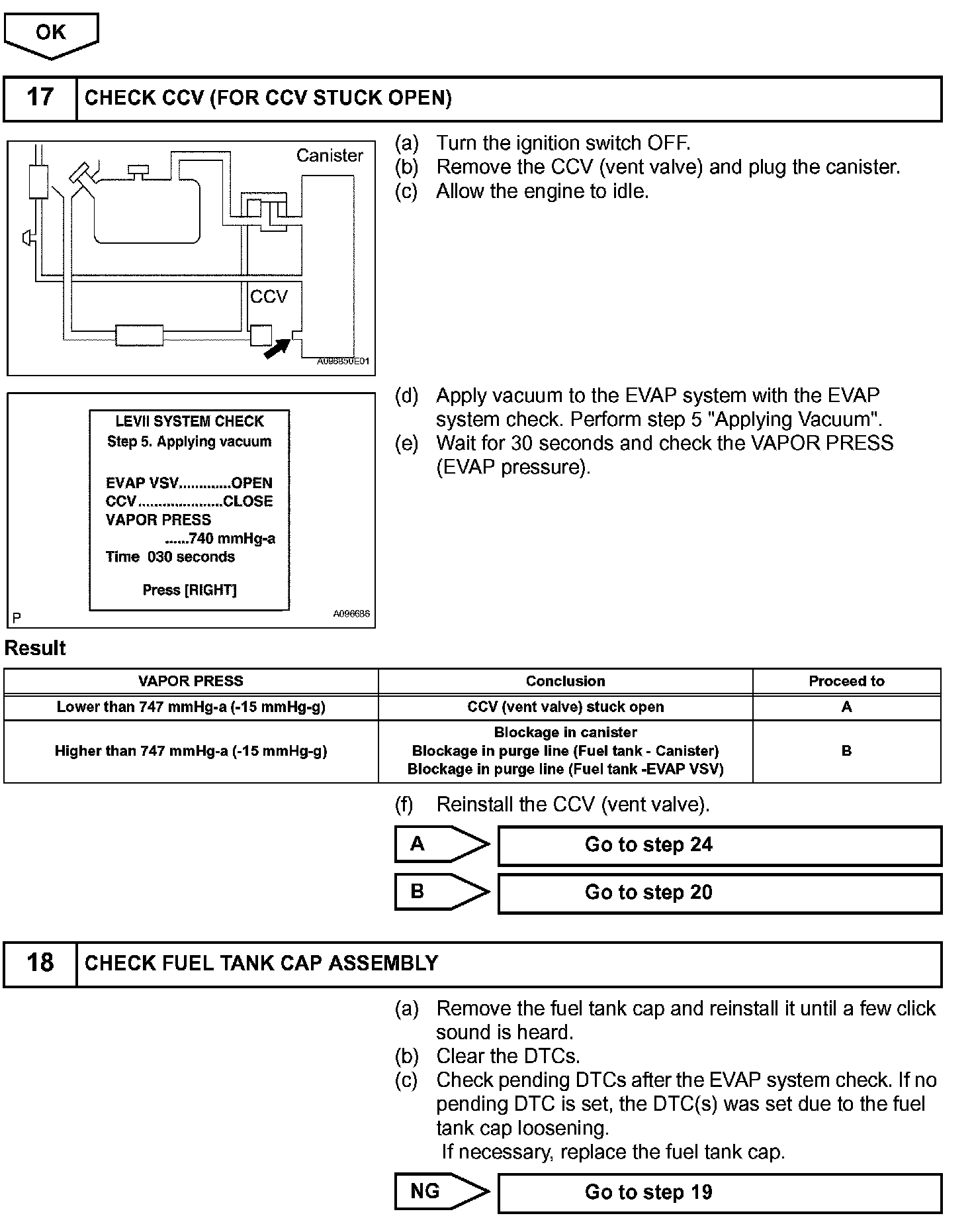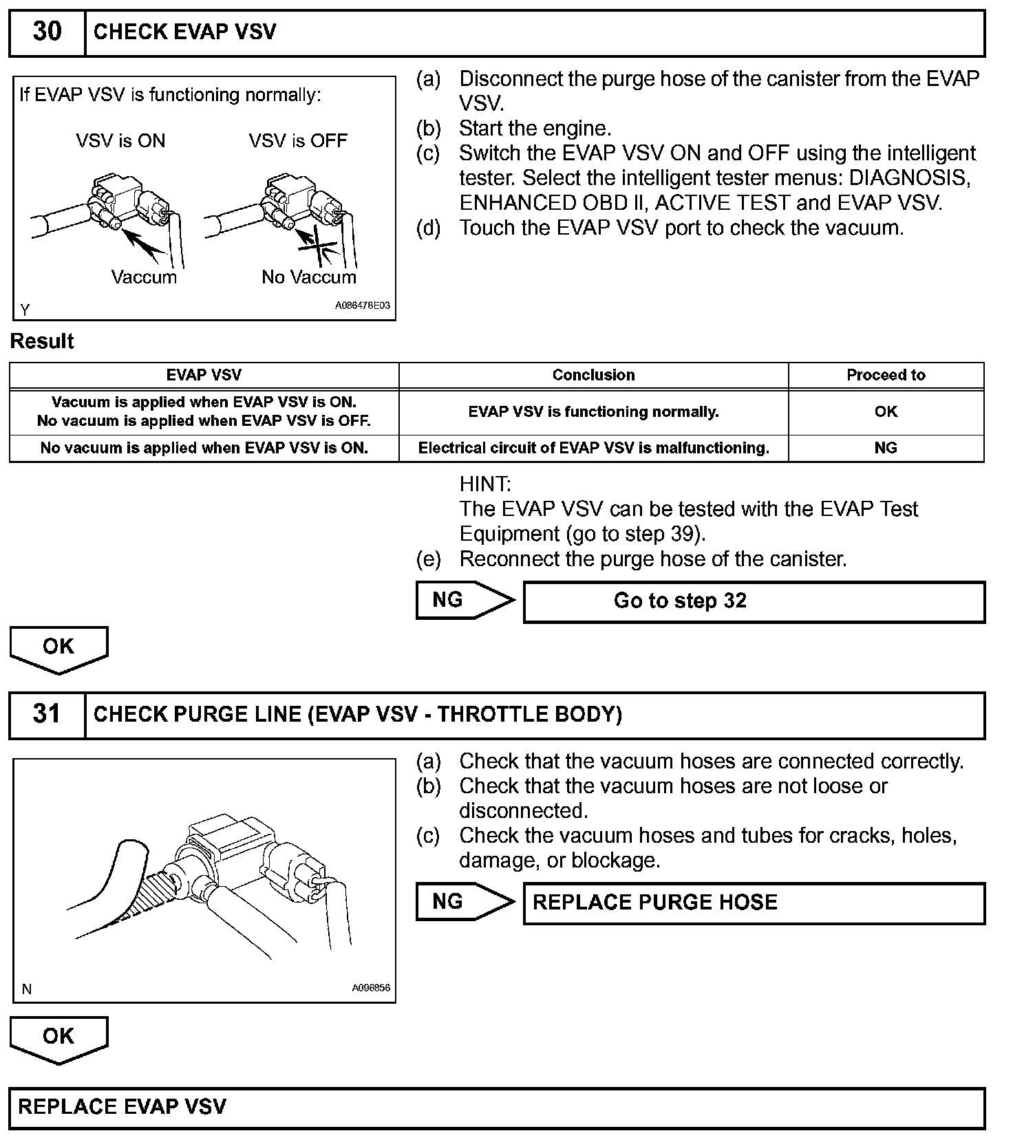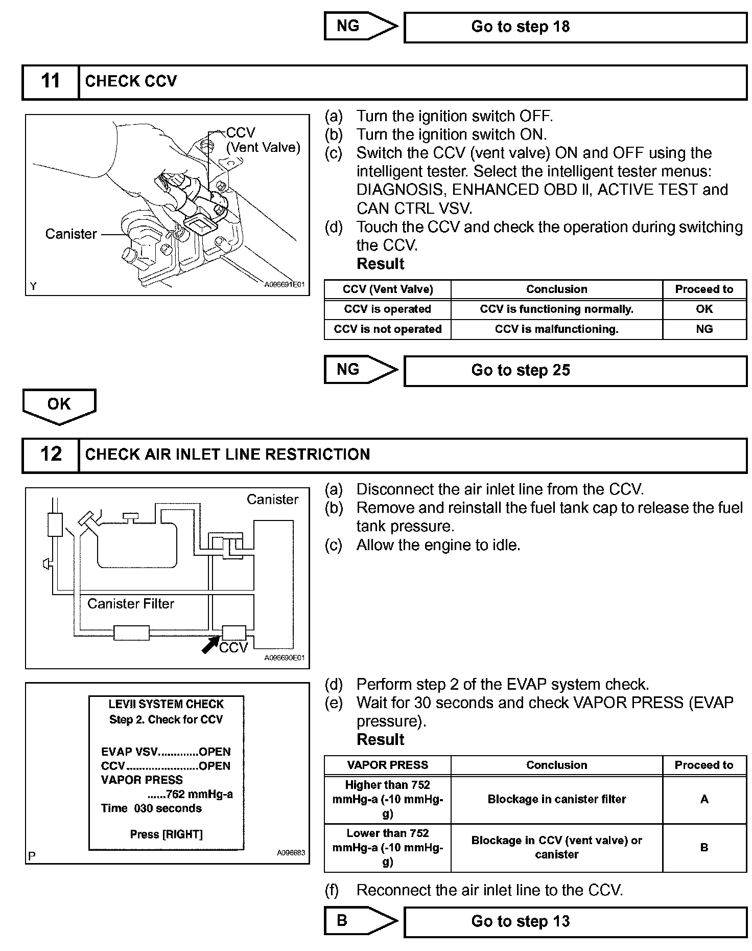The EVAP monitor's purpose is to check for EVAP leaks and EVAP VSV and CCV malfunctions. The monitor performs the check by first introducing the intake manifold's negative pressure (vacuum) to the EVAP system. Then, the monitor records change in the EVAP system's pressure levels. The monitor runs when the following conditions are met: