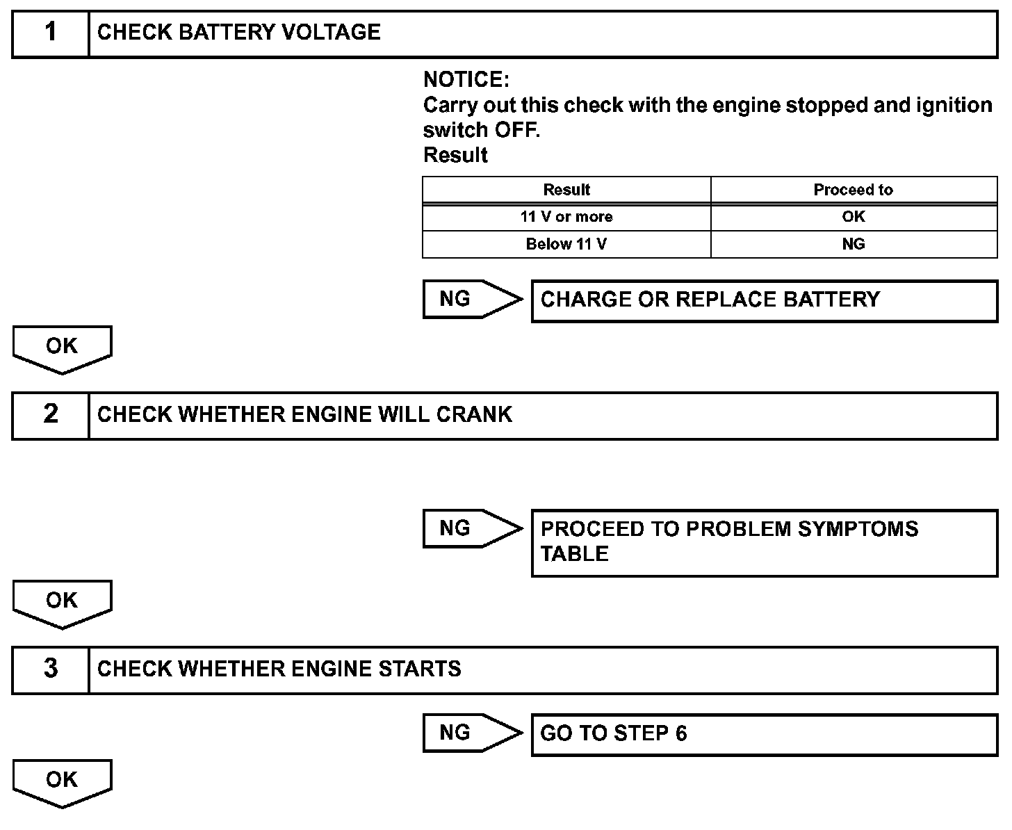 When the malfunction is not confirmed by the DTC check, troubleshooting should be carried out in all circuits considered to be possible causes of the problem. In many cases, by carrying out the basic engine check shown in the flowchart, the location of the problem can be found quickly and efficiently. Therefore, using this check is essential when engine troubleshooting.