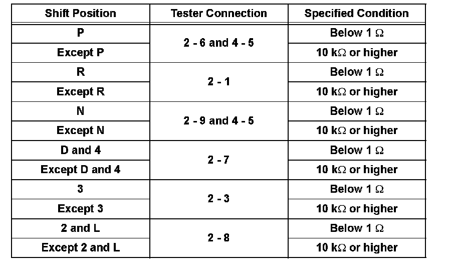 c. Measure the resistance according to the value(s) in the table when the shift lever is moved to each position.