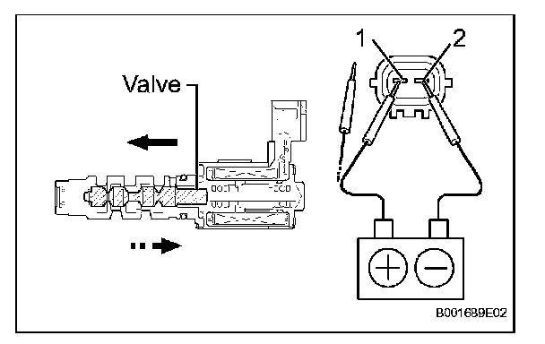 1. Connect the positive (+) lead from the battery to terminal 1 and negative (-) lead to terminal 2, and check the movement of the valve.