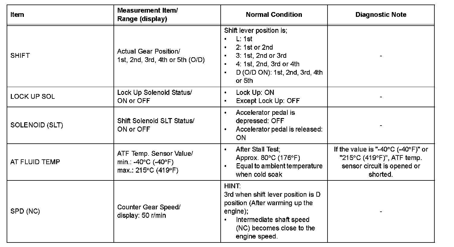 NOTICE: In the table below, the values listed under Normal Condition are reference values. Do not depend solely on these reference values when deciding whether a part is faulty or not.