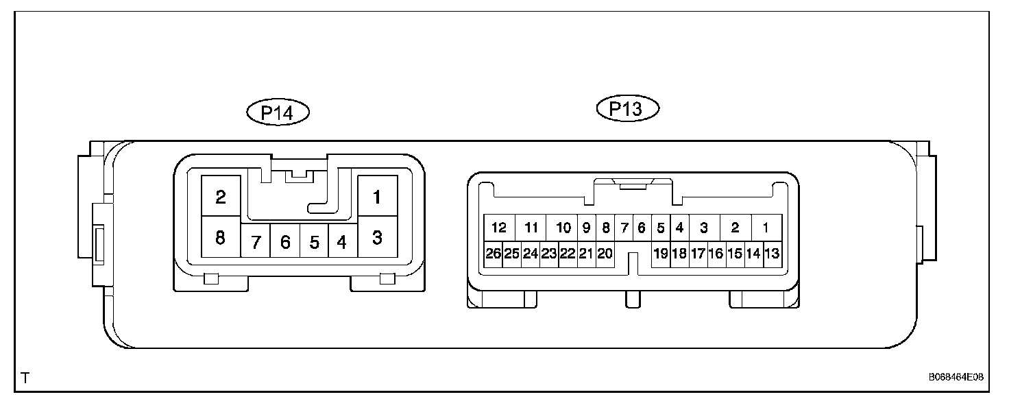 a. Disconnect the P13 and P14 ECU connectors, and check the voltage and resistance of each terminal of the wire harness side connectors.