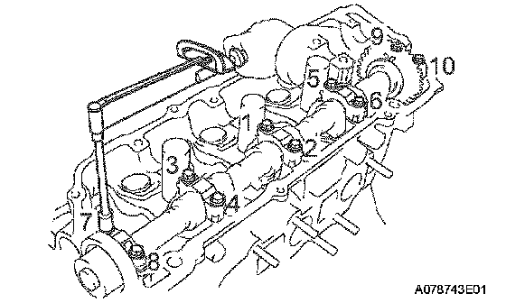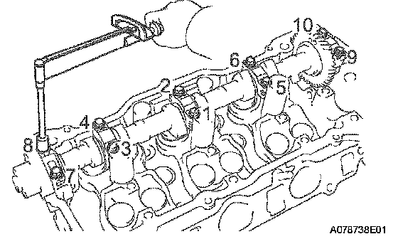 Cylinder Head Sub-Assembly Torque & SequenceUsing several steps, install and tighten the 8 cylinder head bolts uniformly in the sequence shown in the illustration (procedure "A").