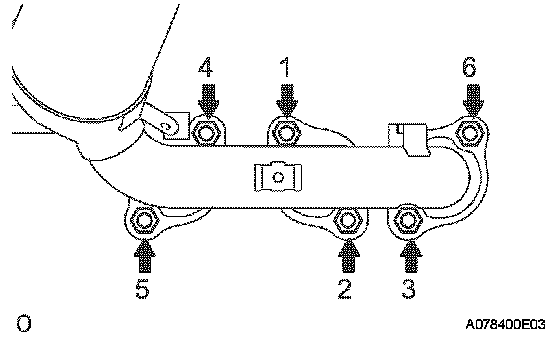 Install a new gasket and the exhaust manifold RH with the 6 nuts. Using several steps, tighten the nuts uniformly in the sequence shown in the illustration.