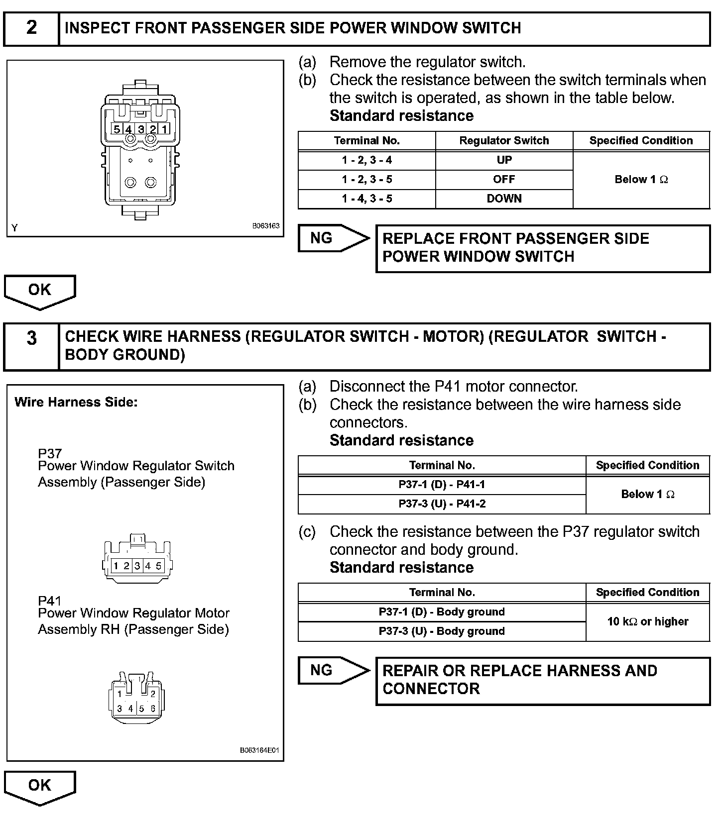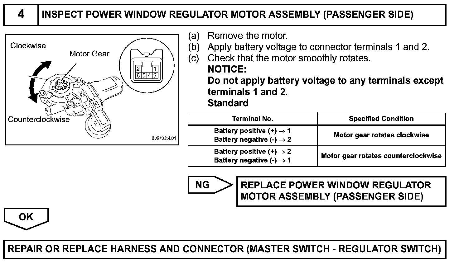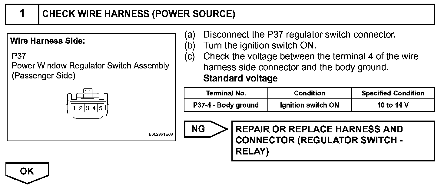 If the manual UP/DOWN function does not operate, the power window motor, the regulator switch or the wire harness may be malfunctioning.