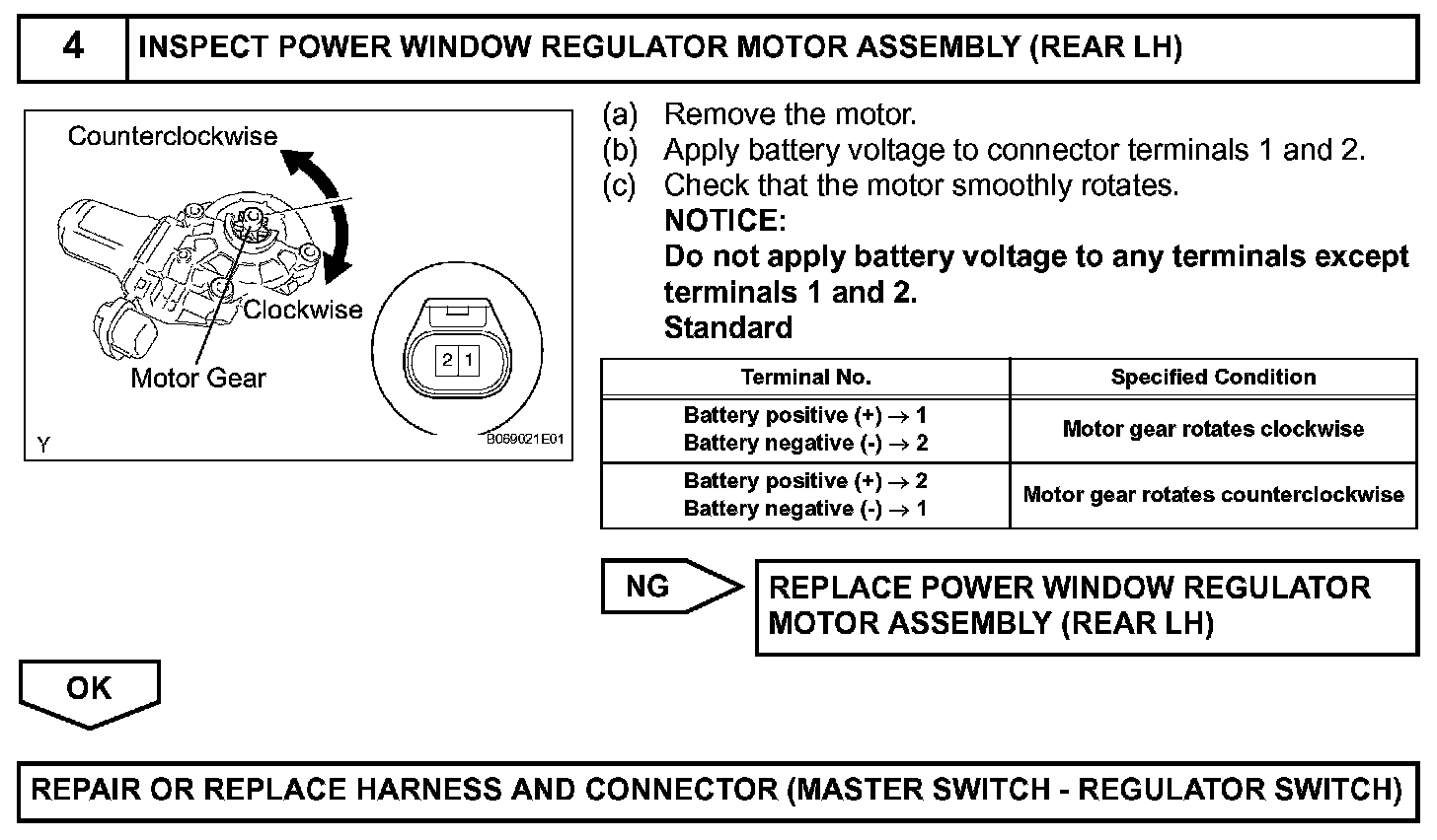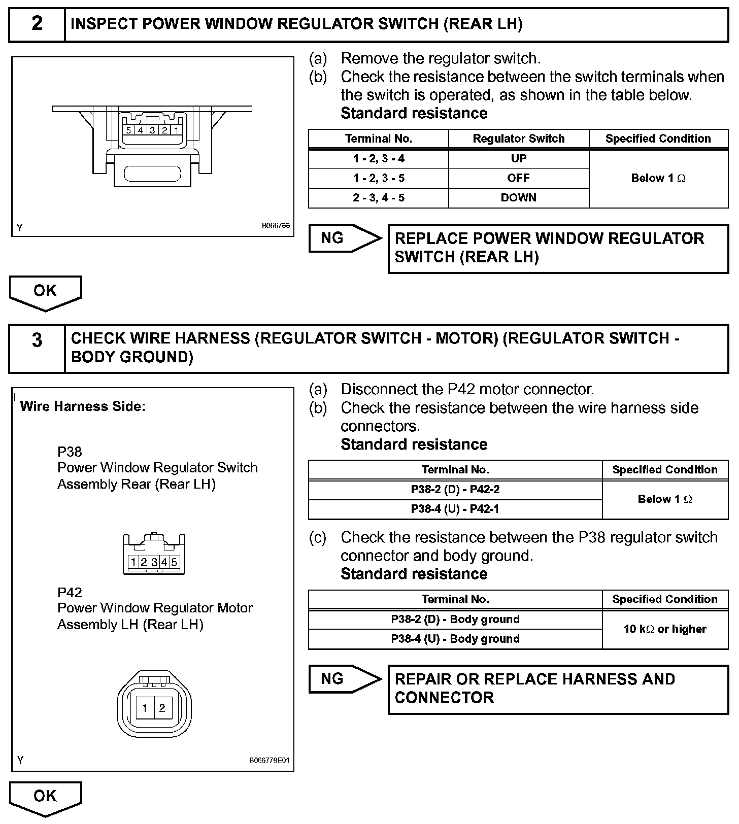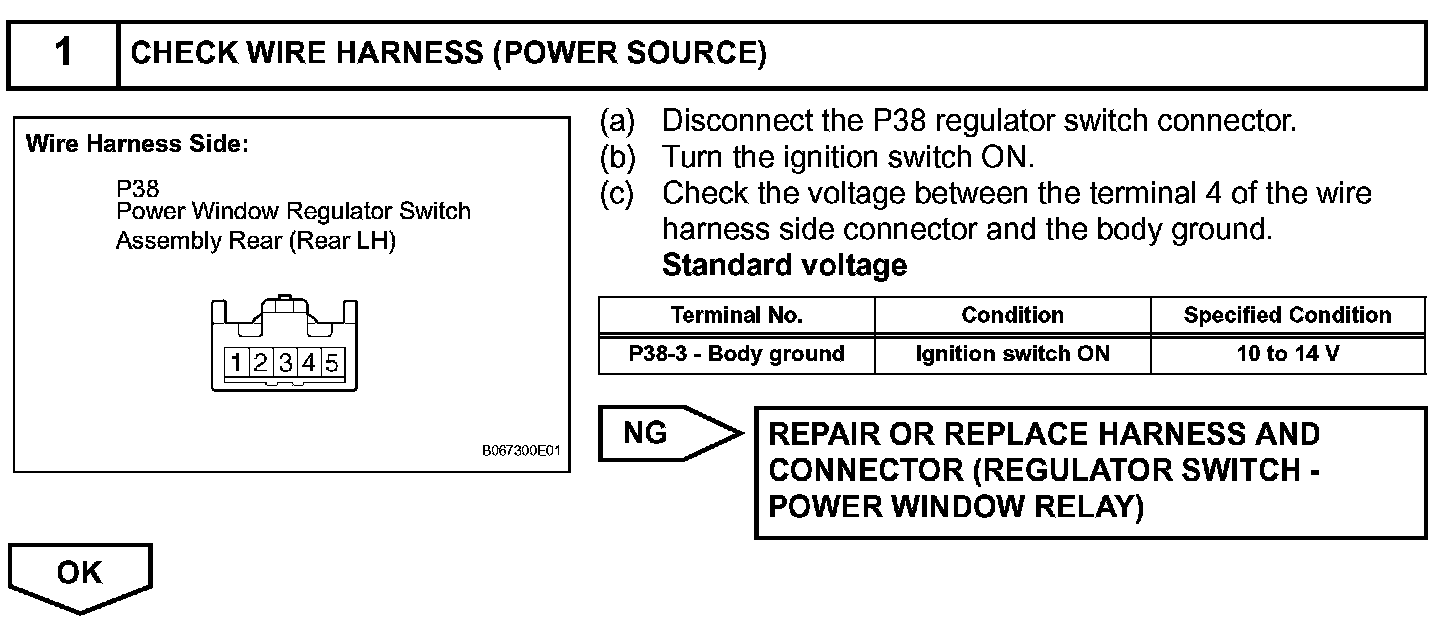 If the manual UP/DOWN function does not operate, the power window motor, the regulator switch or the wire harness may be malfunctioning.
