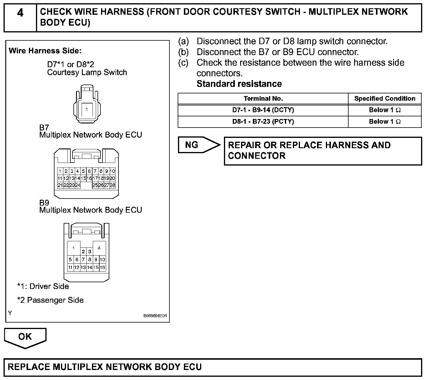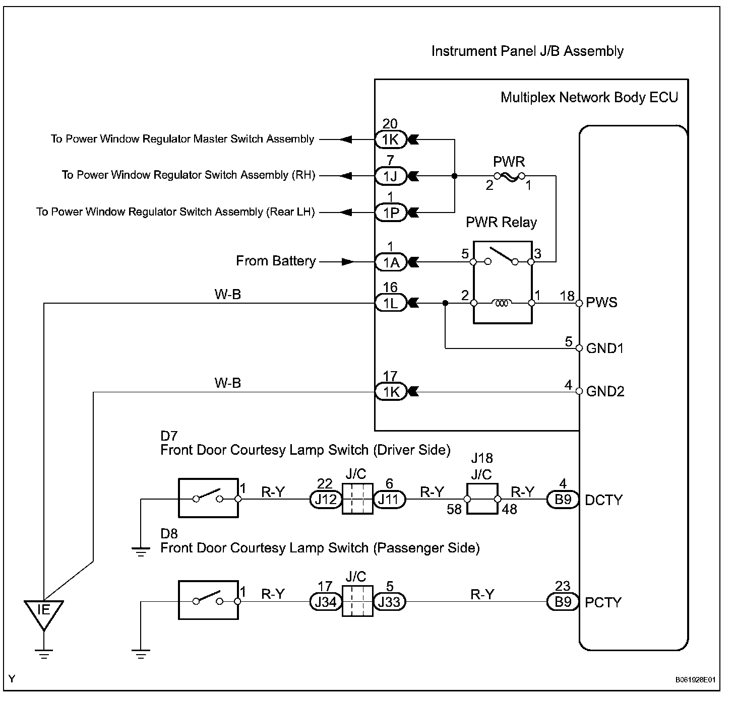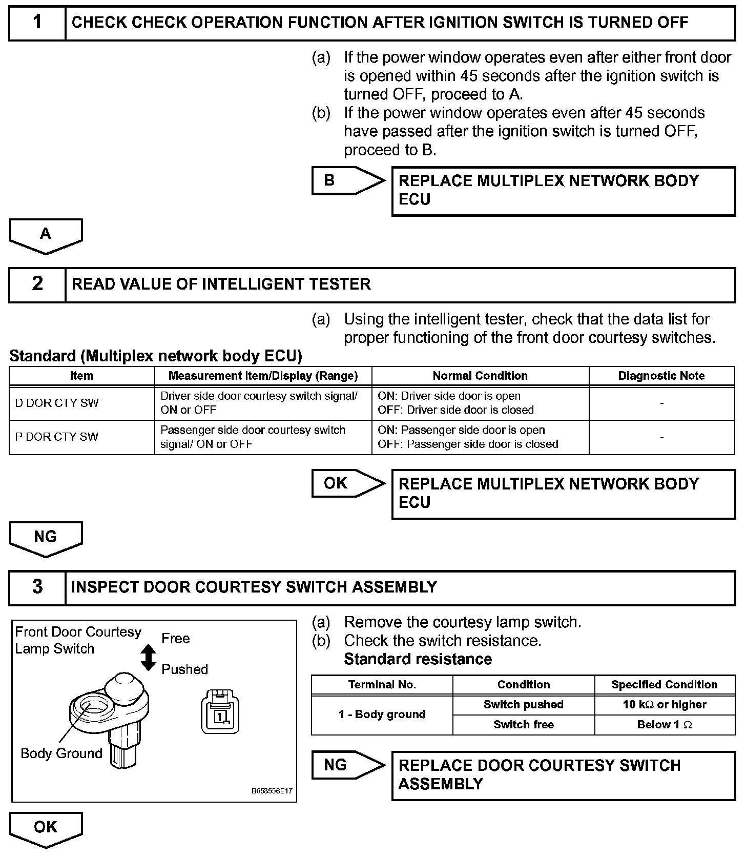 However, if either front door is opened or if a signal from any of the front door courtesy lamp switches is input to the ECU during 45 seconds, or if 45 seconds pass with nothing being done, the multiplex network body ECU will stop supplying power, thus disabling power window operation disabled.