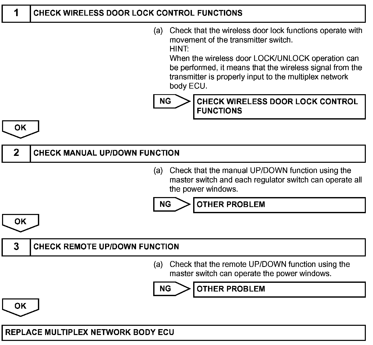 When the switch on the transmitter is operated during normal operating conditions, the multiplex network body ECU sends a request signal to the master switch and the regulator switches which then drive the applicable power window motors.