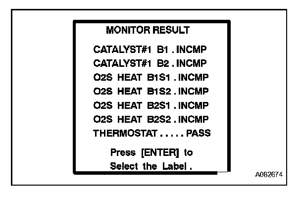 a. Select from the tester menus: DIAGNOSIS, ENHANCED OBD II, MONITOR INFO and MONITOR RESULT. The monitor result appears after the component name.