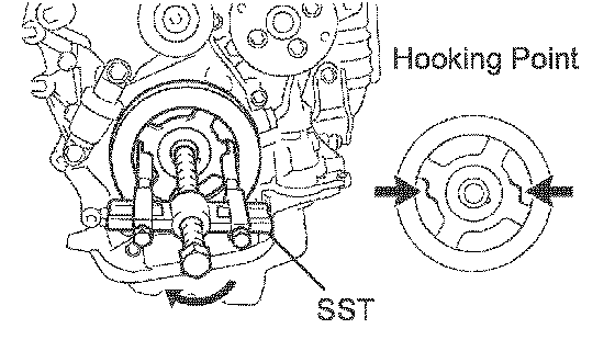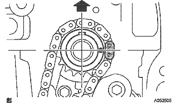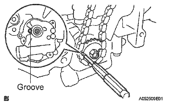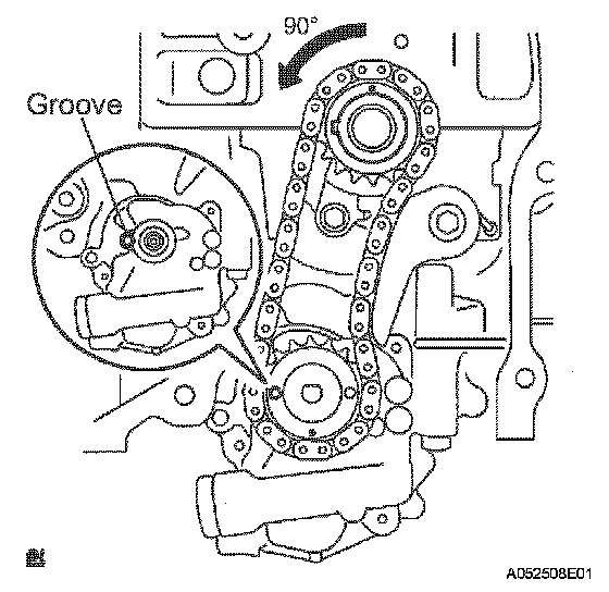 a. Turn the crankshaft counterclockwise by 90°, and align an adjusting hole of the oil pump driven sprocket with the groove of the oil pump.