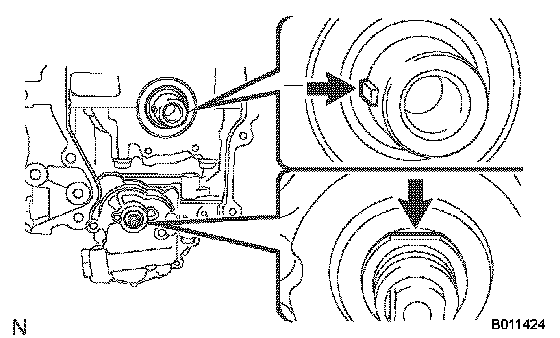 1 Align the timing marks of the camshaft timing gear/sprocket and bearing caps (No. 1 and No. 2).