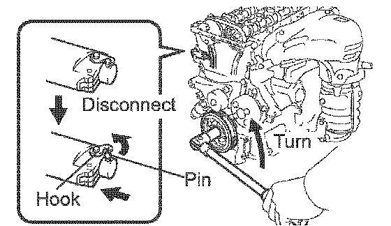 b. Turn the crankshaft counterclockwise and disconnect the plunger knock pin from the hook.