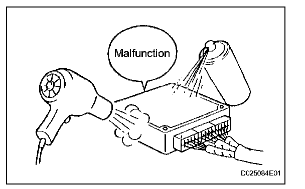 With a problem that only occurs when the engine is cold or as a result of vibration caused by the road during driving, the problem can never be determined if the symptoms are being checked on a stationary vehicle or on a vehicle with a warmed-up engine. Vibration, heat or water penetration (moisture) is difficult to reproduce. The symptom simulation tests below are effective substitutes for the conditions and can be applied on a stationary vehicle. Important points in the symptom simulation test: