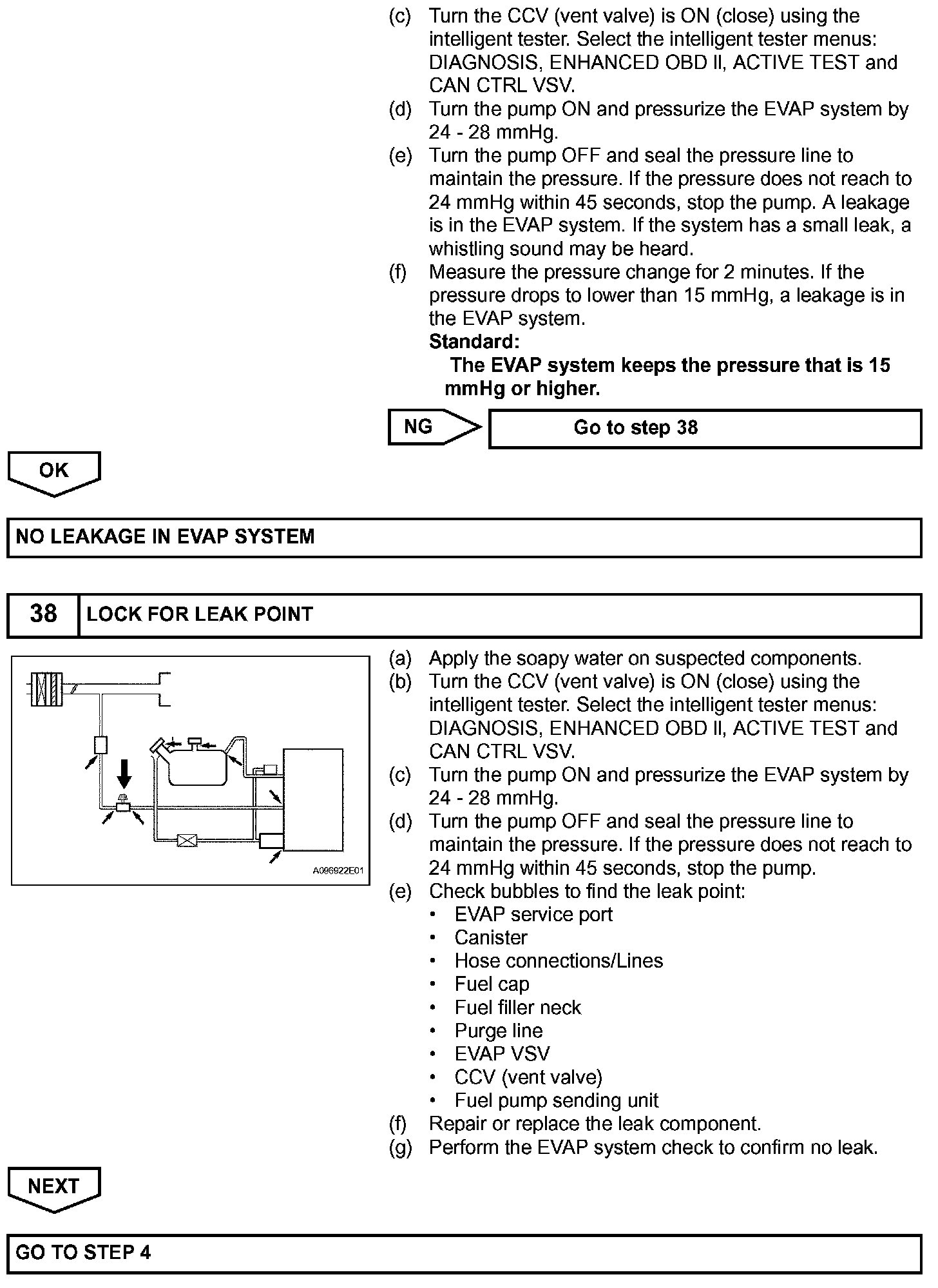 The EVAP monitor's purpose is to check for EVAP leaks and EVAP VSV and CCV malfunctions. The monitor performs the check by first introducing the intake manifold's negative pressure (vacuum) to the EVAP system. Then, the monitor records change in the EVAP system's pressure levels. The monitor runs when the following conditions are met:
