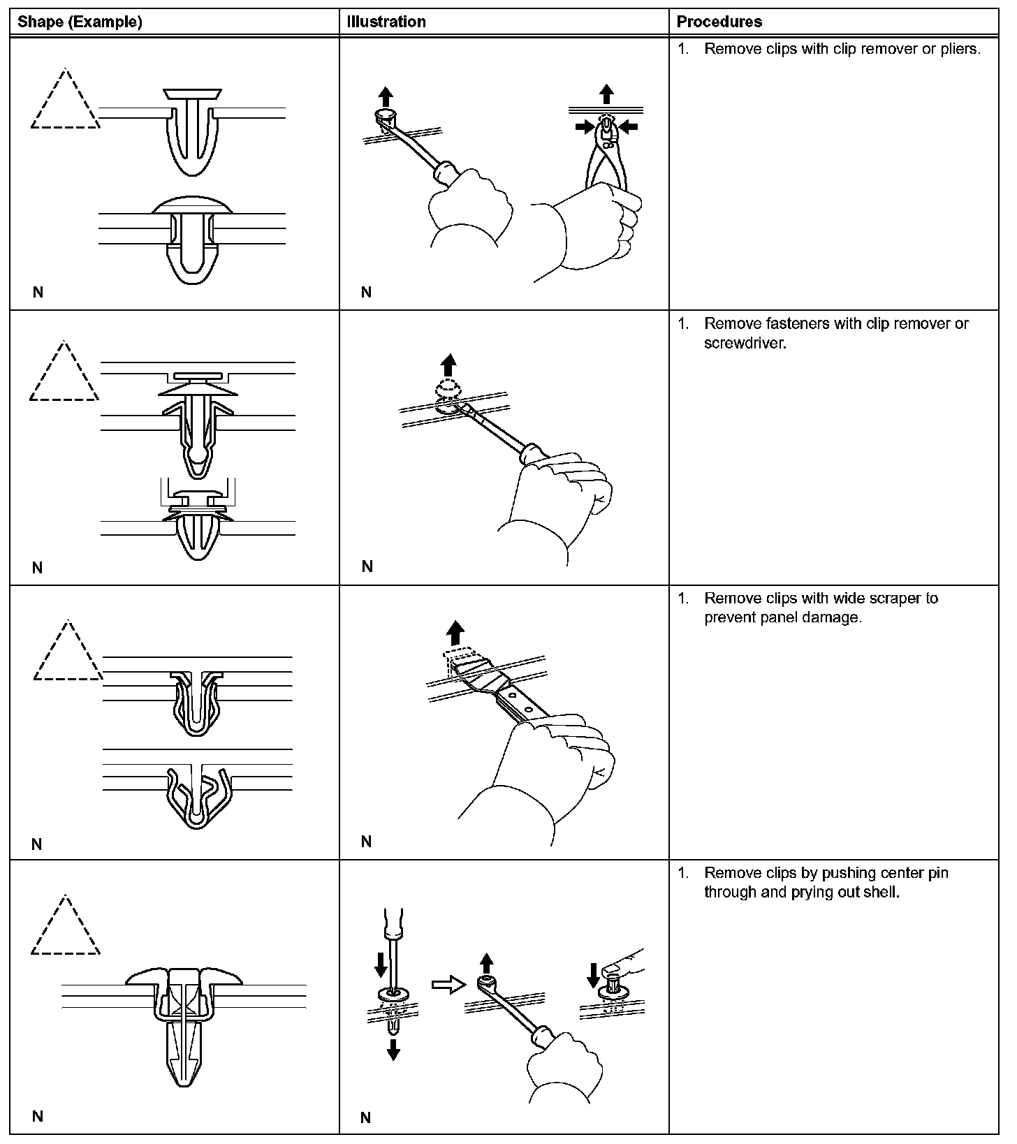1. The removal and installation methods of typical clips used for vehicle body parts are shown in the table.