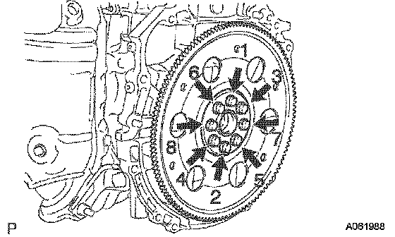 Install the front spacer, drive plate and rear spacer with 8 bolts. Uniformly tighten the 8 bolts in the sequence shown in the illustration.