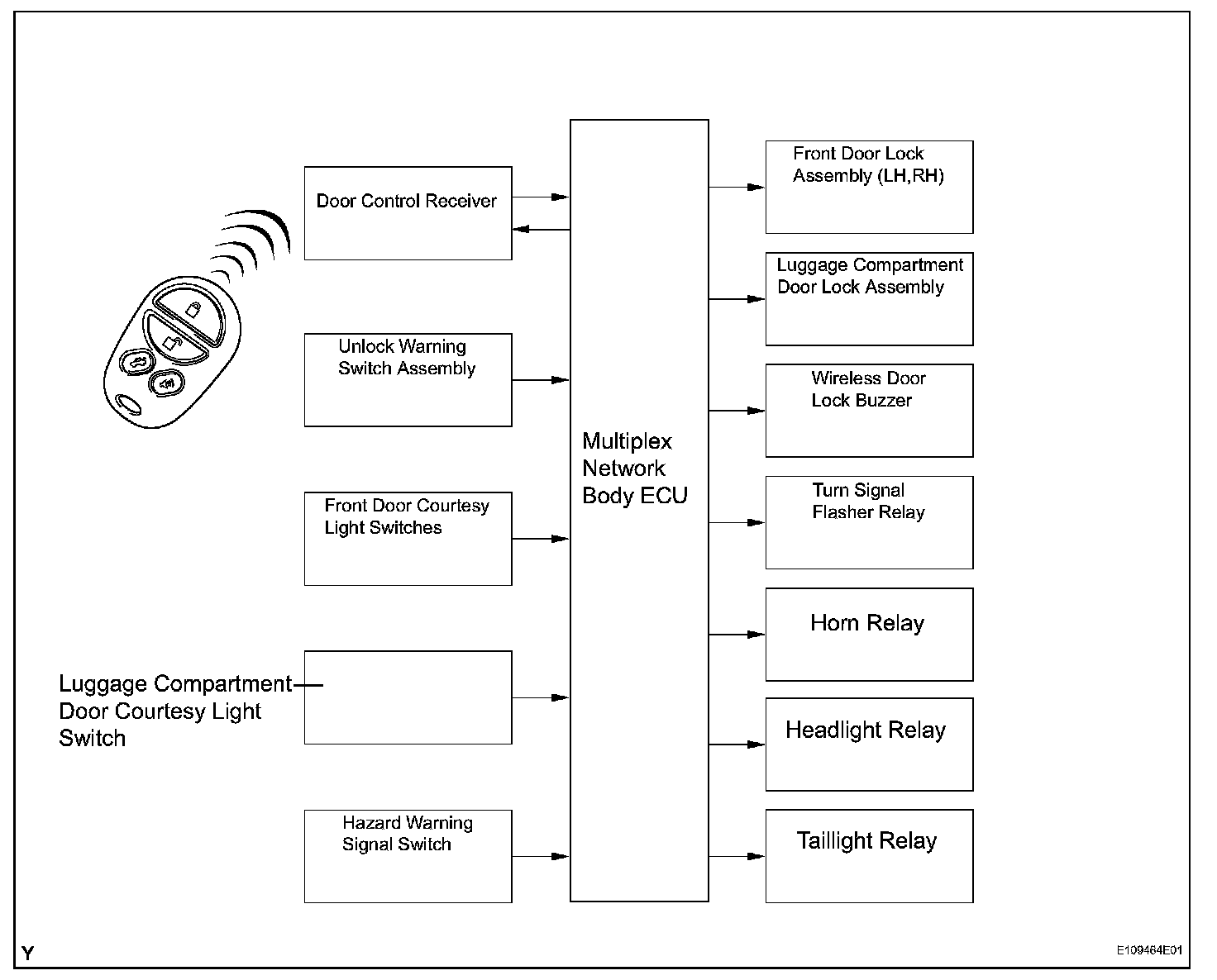 - The door control receiver performs the code identification process and the multiplex network body ECU operates the door lock control. A serial data link is provided for communication between the door control receiver and the multiplex network body ECU.